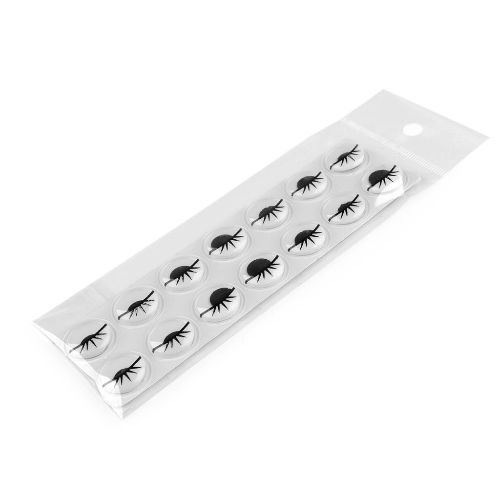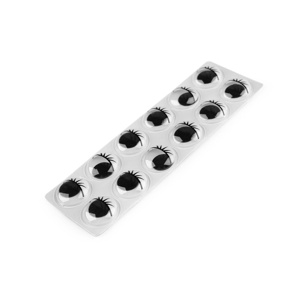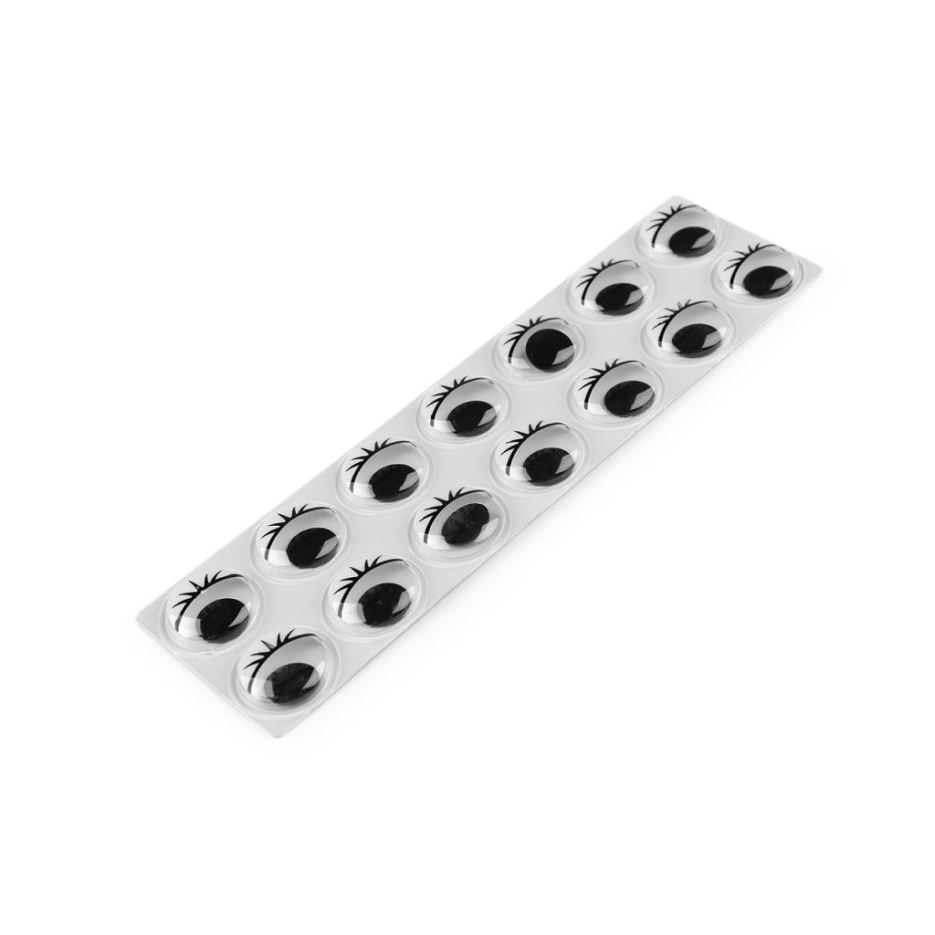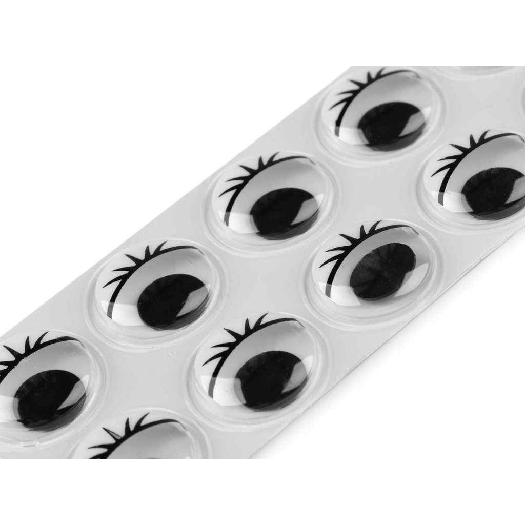 Sadu samolepicích očí z transparentního plastu můžete použít při výrobě zvířátek, panáčků, panenek, přáníček a postaviček nebo k ozdobě mobilu, tabletu, krabiček apod. Oči jsou pohyblivé, s řasami a poutavě se lesknou. Jsou na blistru po 1 ks podlepené fólií. Celkem na jednom blistru u varianty č. 1 je 14 ks očí a u varianty č. 2 je 12 ks očí.