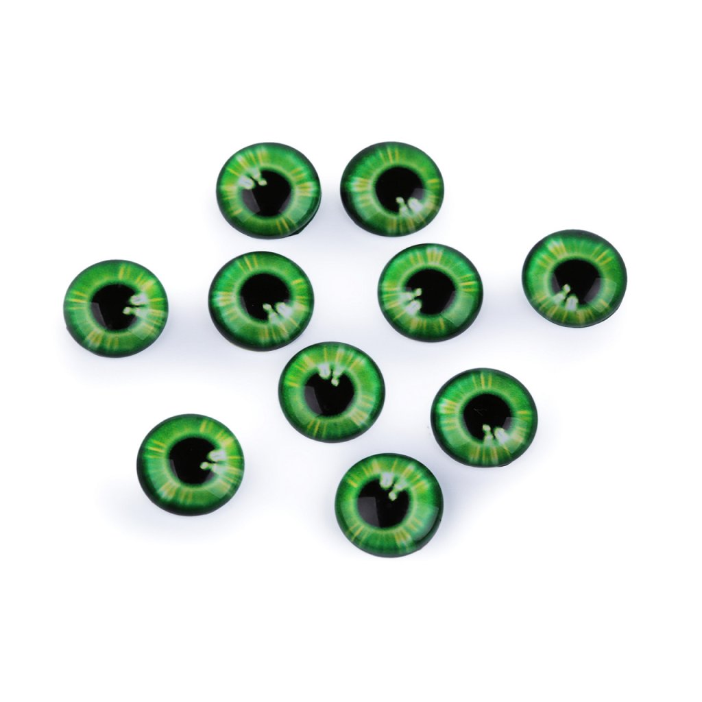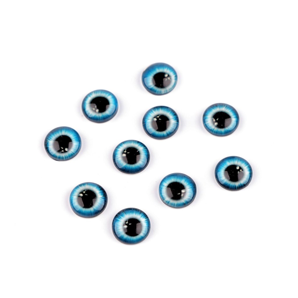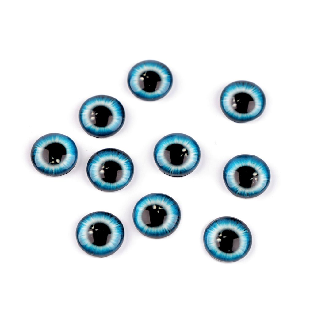 Kulaté skleněné oči mají realistické zpracování panenky. Díky tvaru vypouklé čočky obrázek oka krásně vynikne. Využijete je na tvorbu různých postaviček a zvířátek. Pro jejich přilepení je vhodné použít lepidlo na lepení kamínků. S oblibou se používají i na výrobu bižuterie, jako kabošony jsou vhodné k nalepení do kovového lůžka nebo k obšití korálky a rokajlem. Velice působivé jsou v drátovaných špercích.
