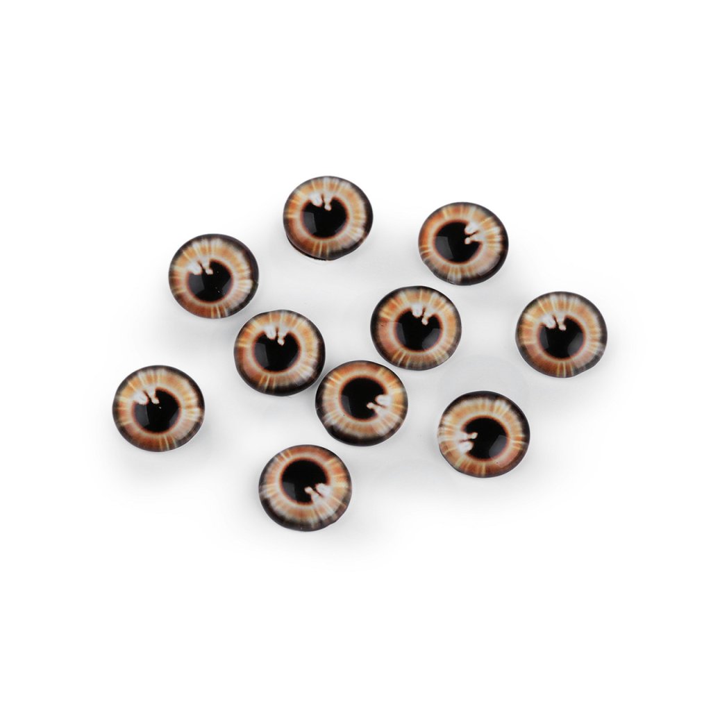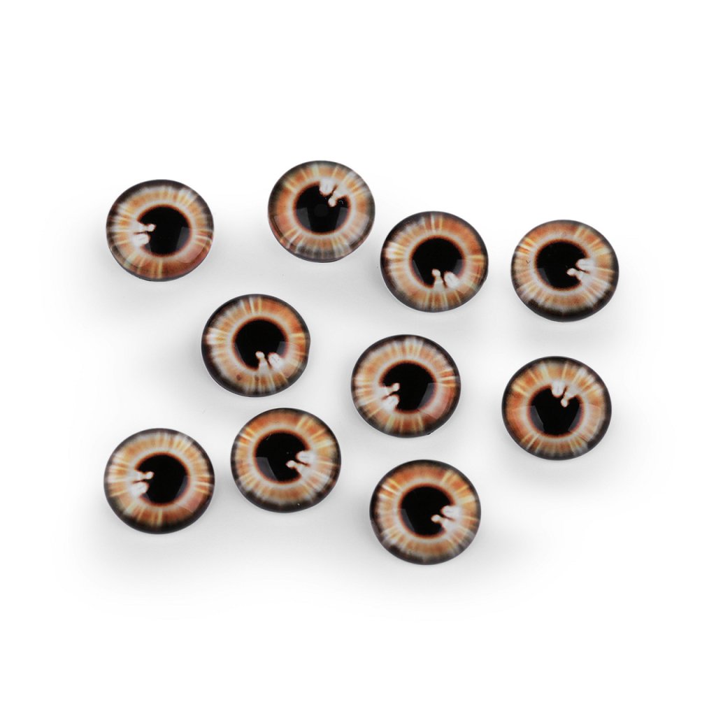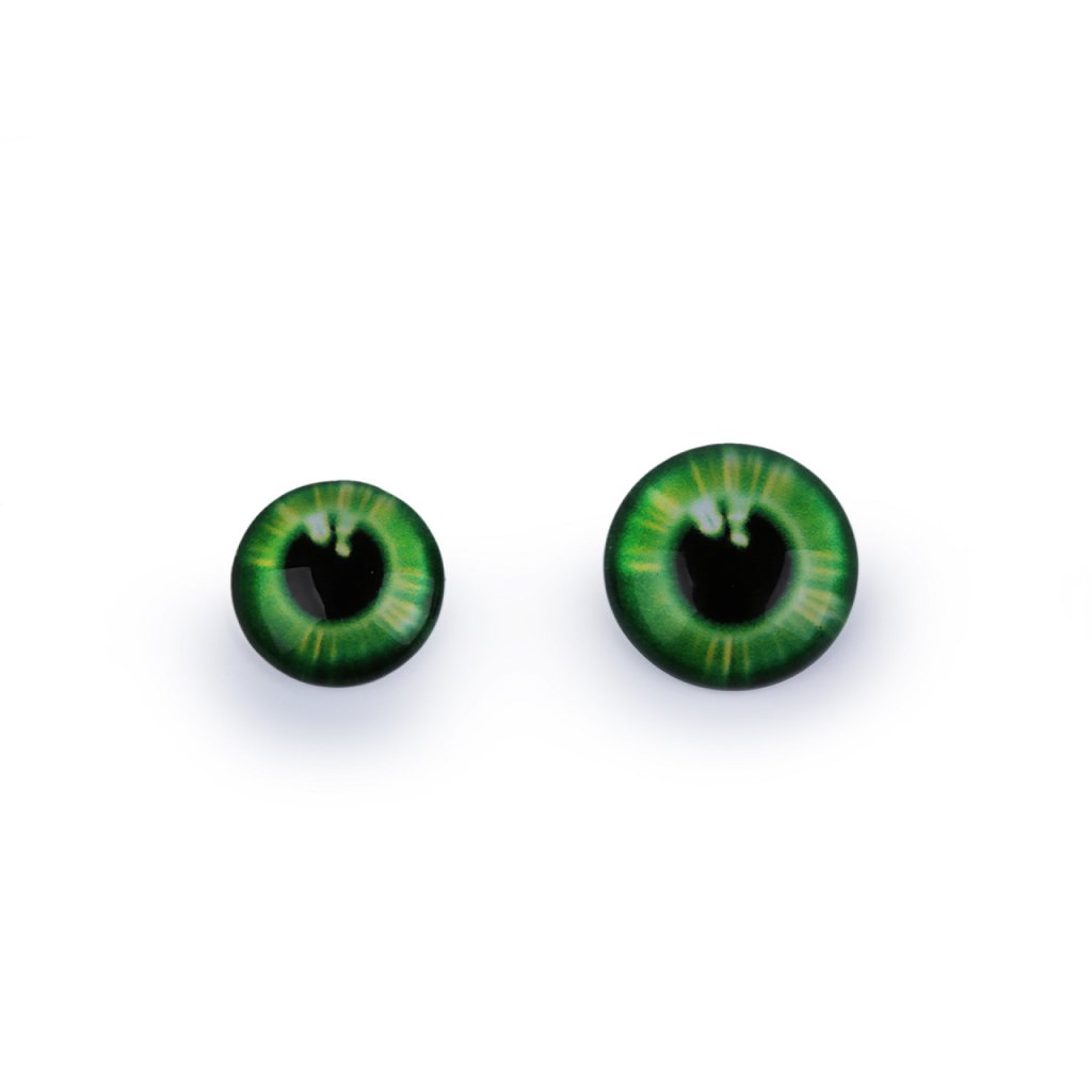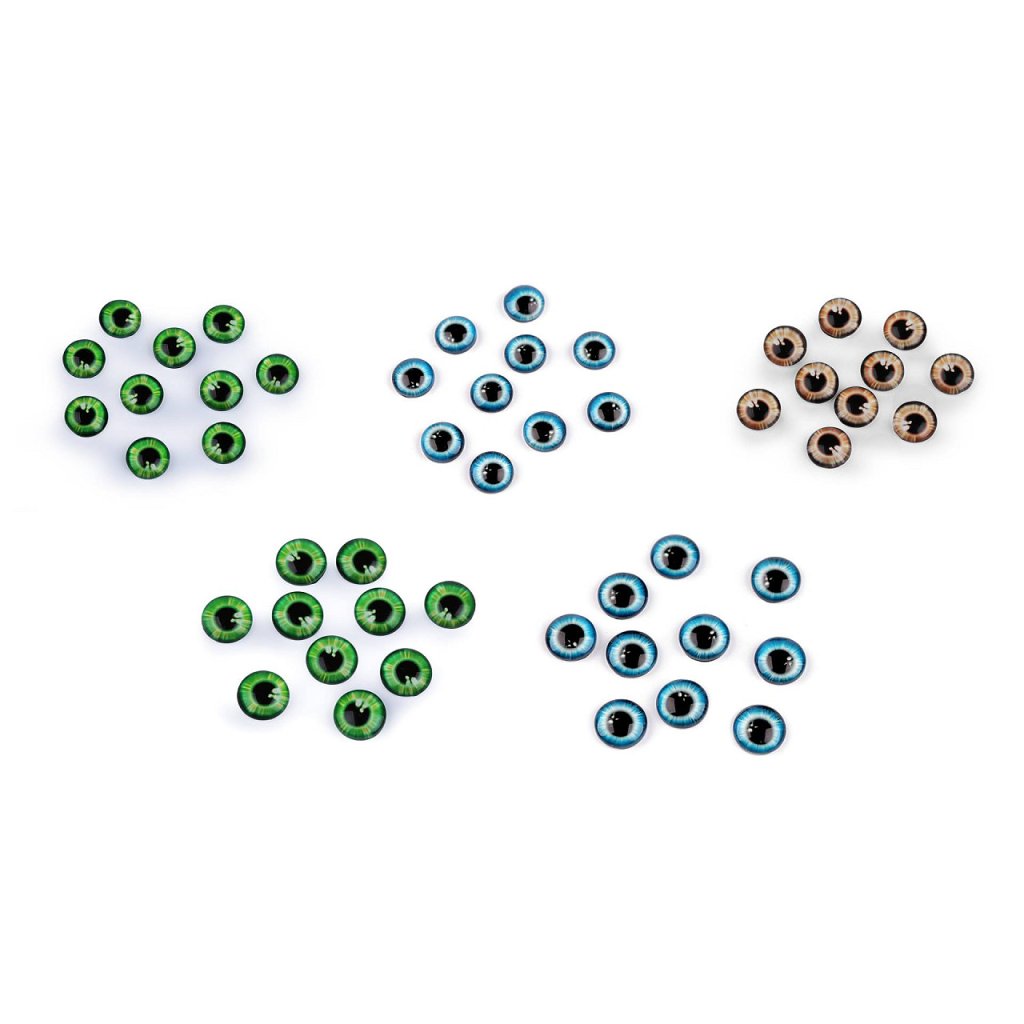 Kulaté skleněné oči mají realistické zpracování panenky. Díky tvaru vypouklé čočky obrázek oka krásně vynikne. Využijete je na tvorbu různých postaviček a zvířátek. Pro jejich přilepení je vhodné použít lepidlo na lepení kamínků. S oblibou se používají i na výrobu bižuterie, jako kabošony jsou vhodné k nalepení do kovového lůžka nebo k obšití korálky a rokajlem. Velice působivé jsou v drátovaných špercích.