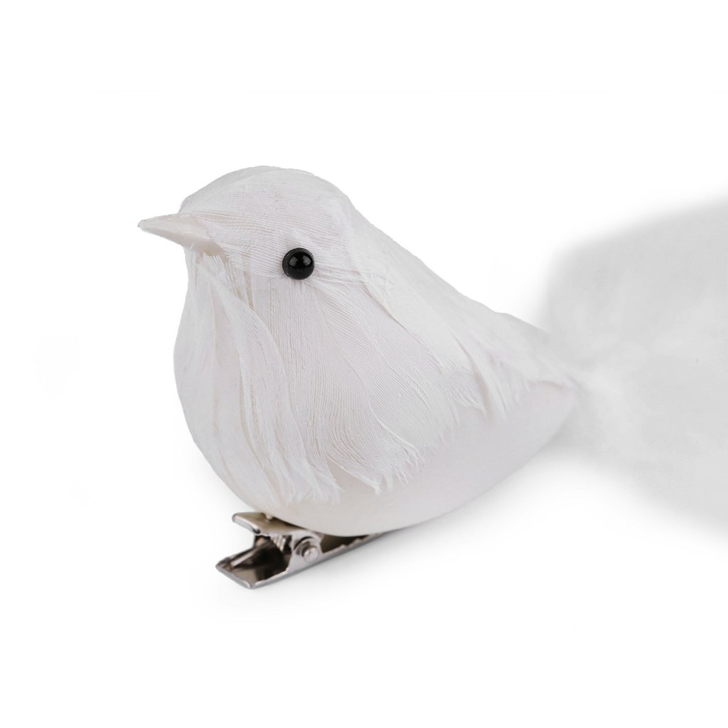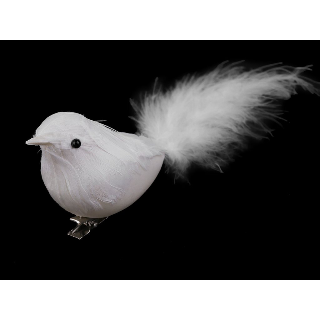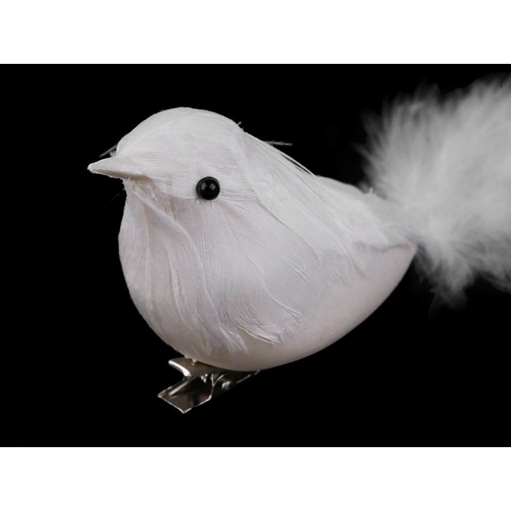 Dekorační ptáček je z vrchní části zdobený peřím, které mu dodává skutečný vjem. Na hlavičce je ozdobený glitry. Zespodu má připevněnou kovovou sponu, díky které můžete ptáčka připevnit například na věnec, větvičku, záclonu či ho naaranžovat do květinových vazeb. Zajímavě vynikne na vánočním stromečku.