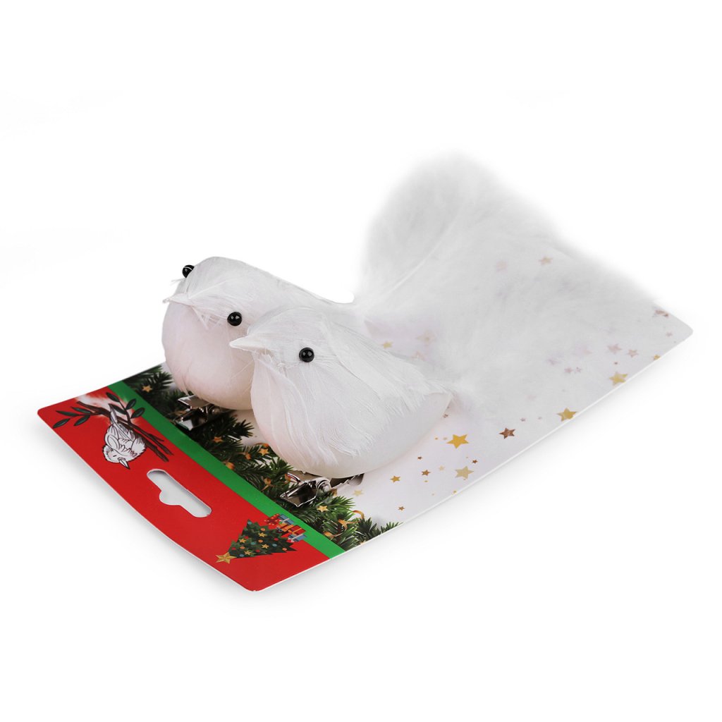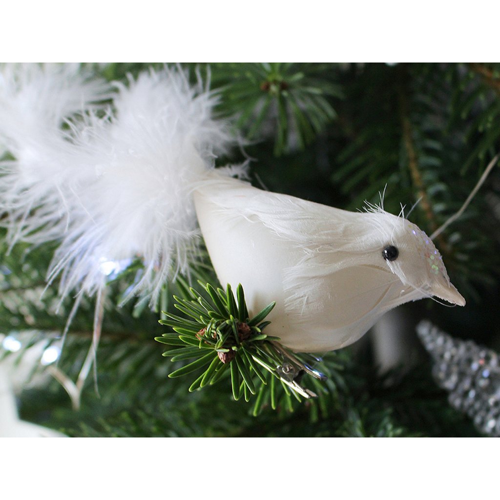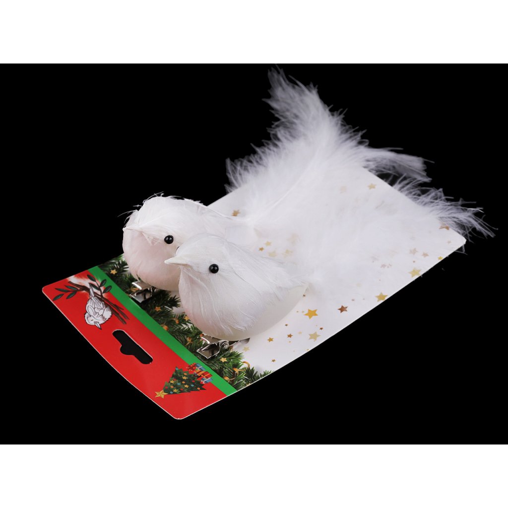 Dekorační ptáček je z vrchní části zdobený peřím, které mu dodává skutečný vjem. Na hlavičce je ozdobený glitry. Zespodu má připevněnou kovovou sponu, díky které můžete ptáčka připevnit například na věnec, větvičku, záclonu či ho naaranžovat do květinových vazeb. Zajímavě vynikne na vánočním stromečku.