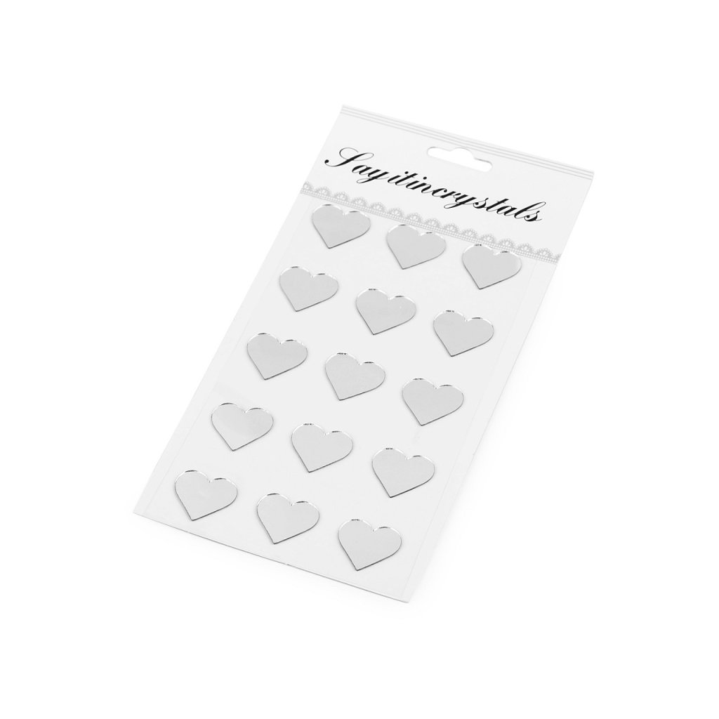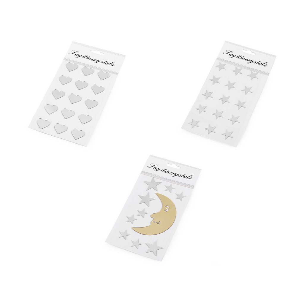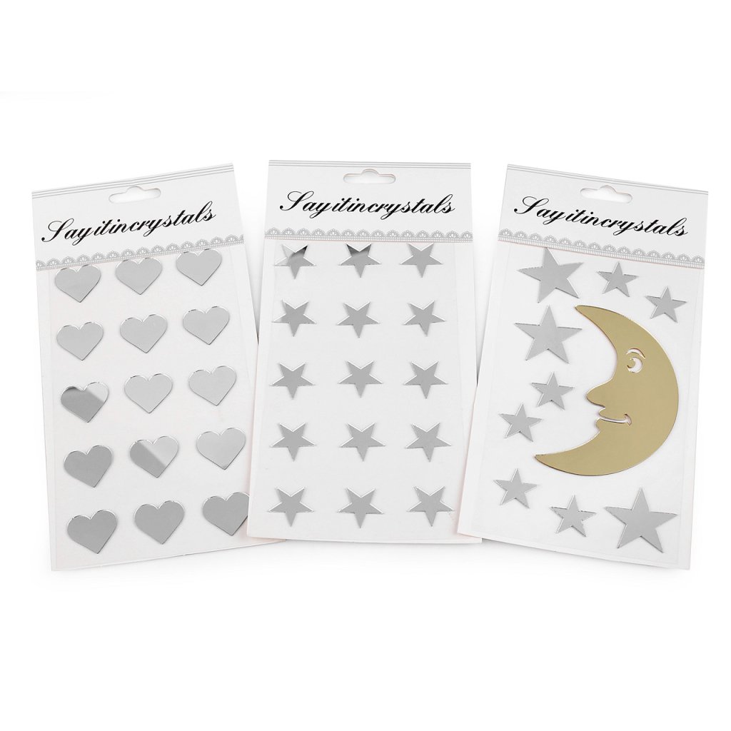 Samolepicí zrcátka ocení všichni příznivci zajímavých dekorací. Zrcátka mají různé tvary a jsou nalepená na jednom archu podkladové folie, ze které se pohodlně odlepí. Hodi se na ozdobení přáníčka, krabičky, květináče, deníku, fotoalba apod.