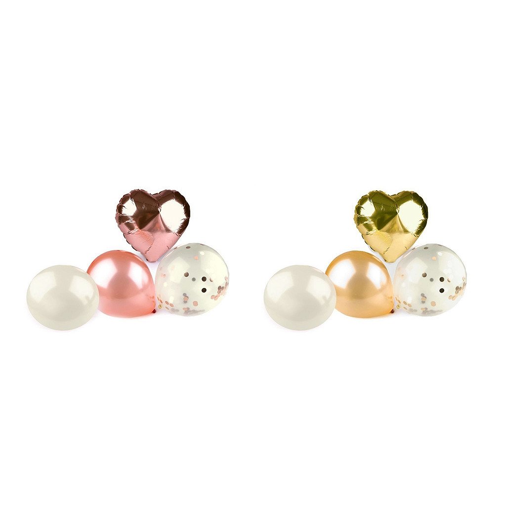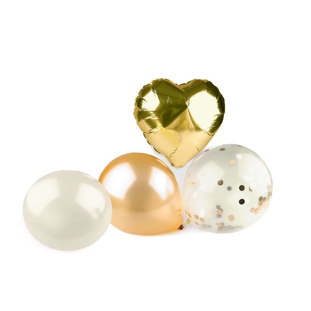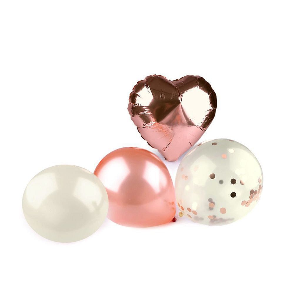 Sada obsahuje celkem 9 balónků - 5 balónků ve dvou různých barvách s perleťovým leskem, 3 balónky s konfetami uvnitř a 1 velký fóliový balónek ve tvaru srdce (40 x 40 cm). V balení je i stuha v kotoučku.