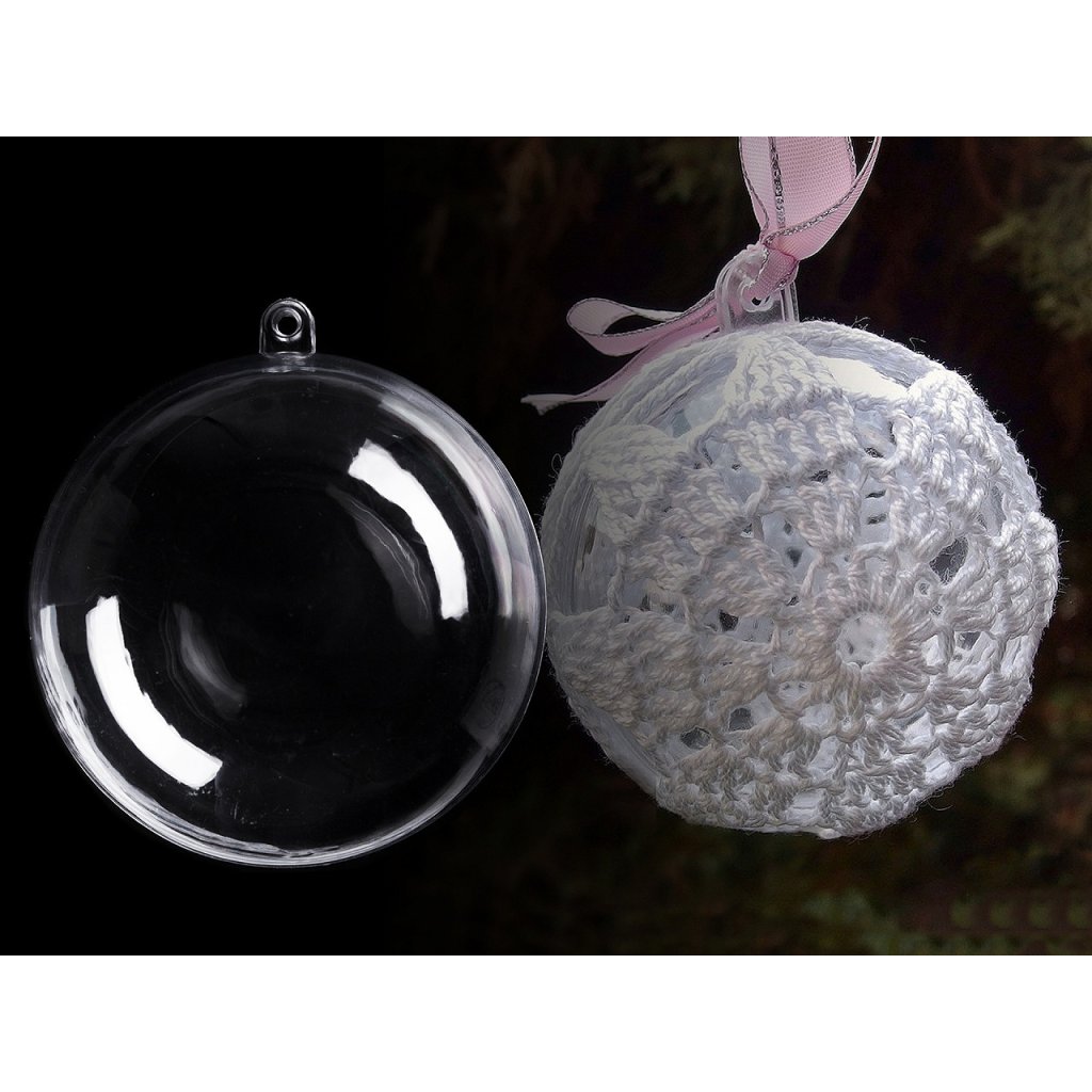 Průhledná plastová koule se skládá ze dvou dílů, které lze spojit a pomocí očka zavěsit jako dekoraci. Je určena k dalšímu dozdobení např. ji můžete obháčkovat, dekorovat metodou quilling, ubrouskovou technikou, dozdobit glitry atd. Fantazii se meze nekladou.
