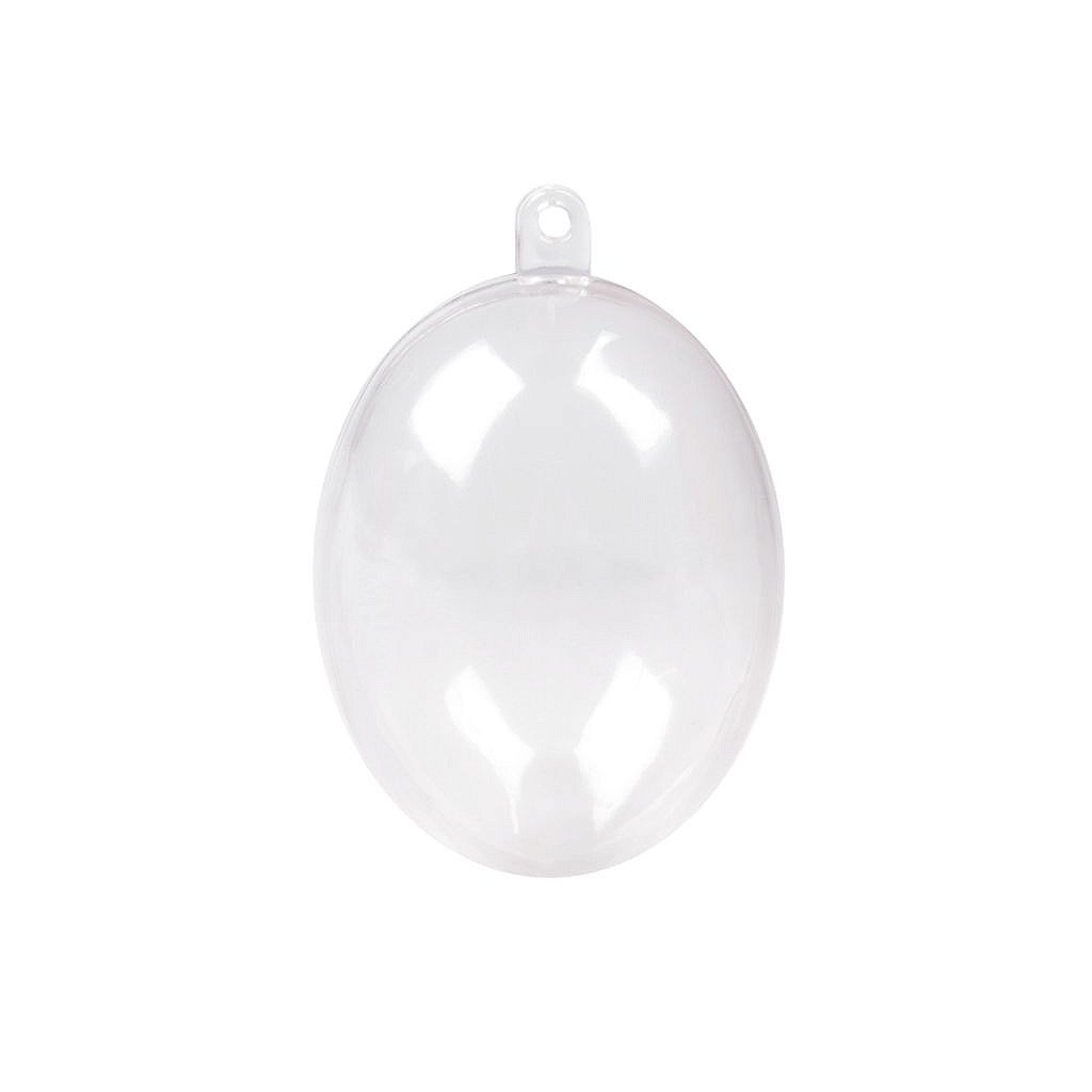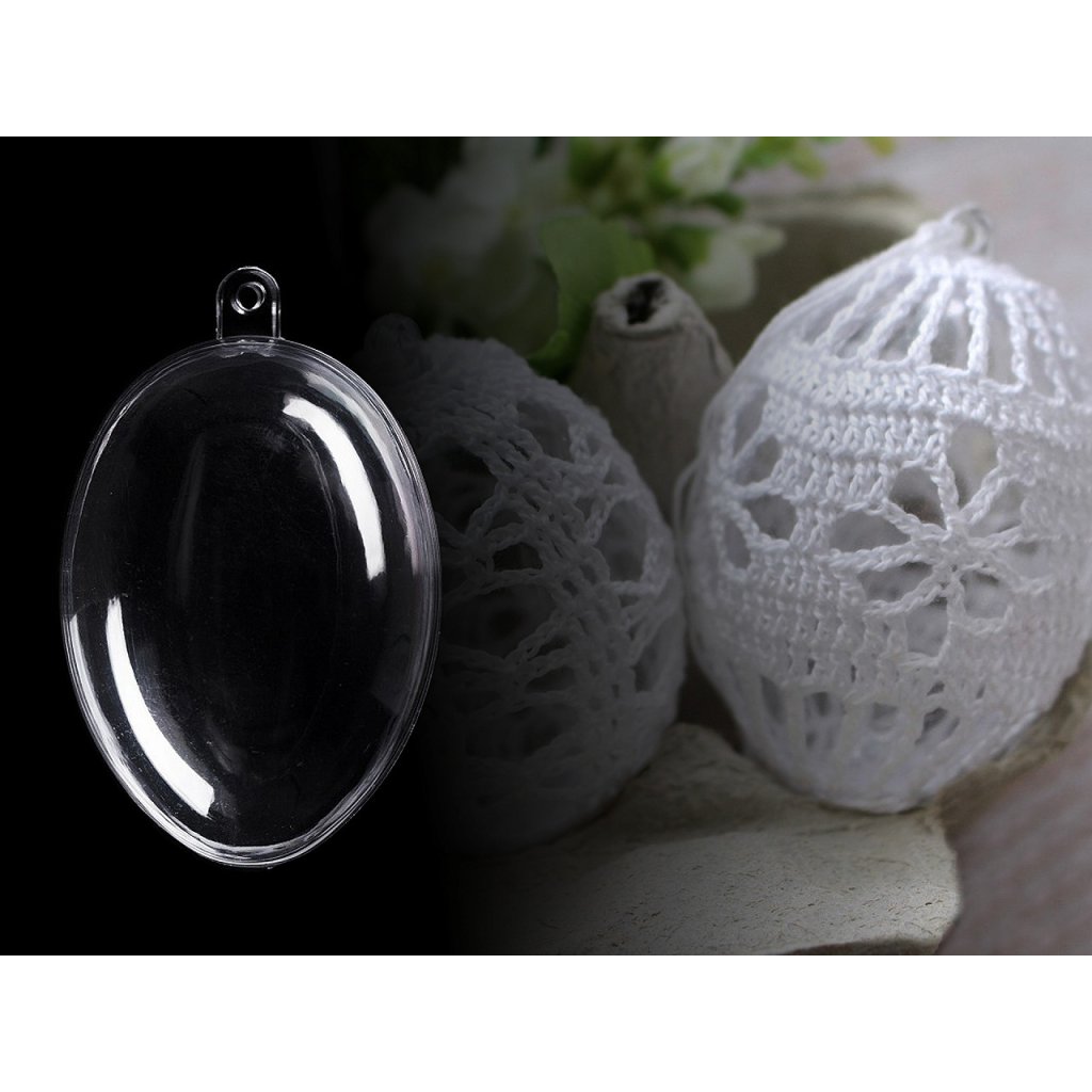 Průhledné plastové vejce se skládá ze dvou částí, které lze spojit a pomocí očka zavěsit jako dekoraci. Jedná se o polotovar, který je určen k dozdobení např. jej můžete obháčkovat, dekorovat metodou quilling, ubrouskovou technikou, dozdobit glitry atd.