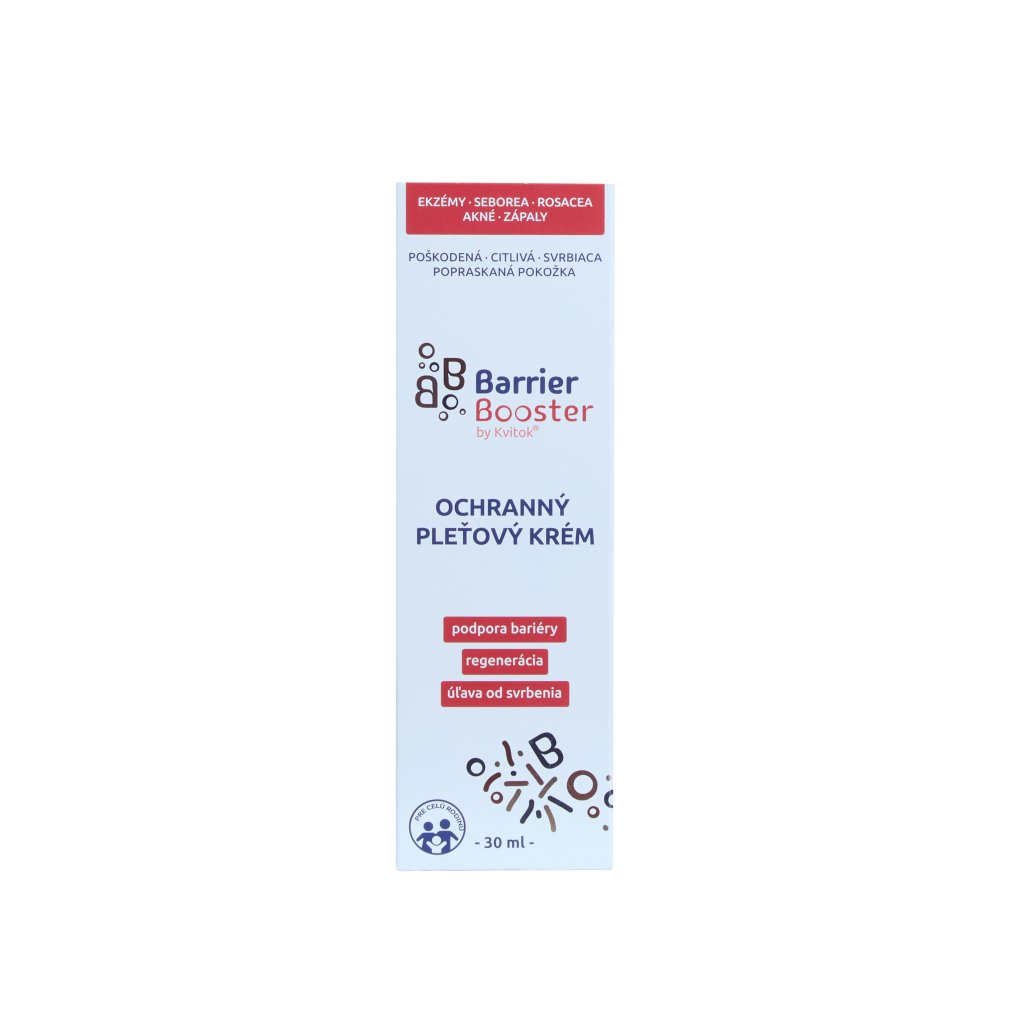 Ochranný pleťový krém Kvitok Barrier Booster šetrně obnovuje přirozenou kožní bariéru a účinně chrání citlivou a poškozenou pokožku. Je speciálně vyvinutý pro péči při kožních potížích jako ekzémy, seborea, rosacea, akné či záněty. Jeho jemná receptura obsahující rostlinné ceramidy a bambucké máslo podporuje rychlou regeneraci pleti, obnovuje hydratační rovnováhu a je velmi dobře snášena i citlivou pokožkou.. Milí zákazníci, pokud jste si oblíbili Prebiotický pleťový krém s ceramidy Dvojitá ochrana a marně po něm pátráte, nemusíte věšet v hlavu. Krém je v podstatě totožný s Ochranným krémem, jen změnil jméno a kabátek. :-)