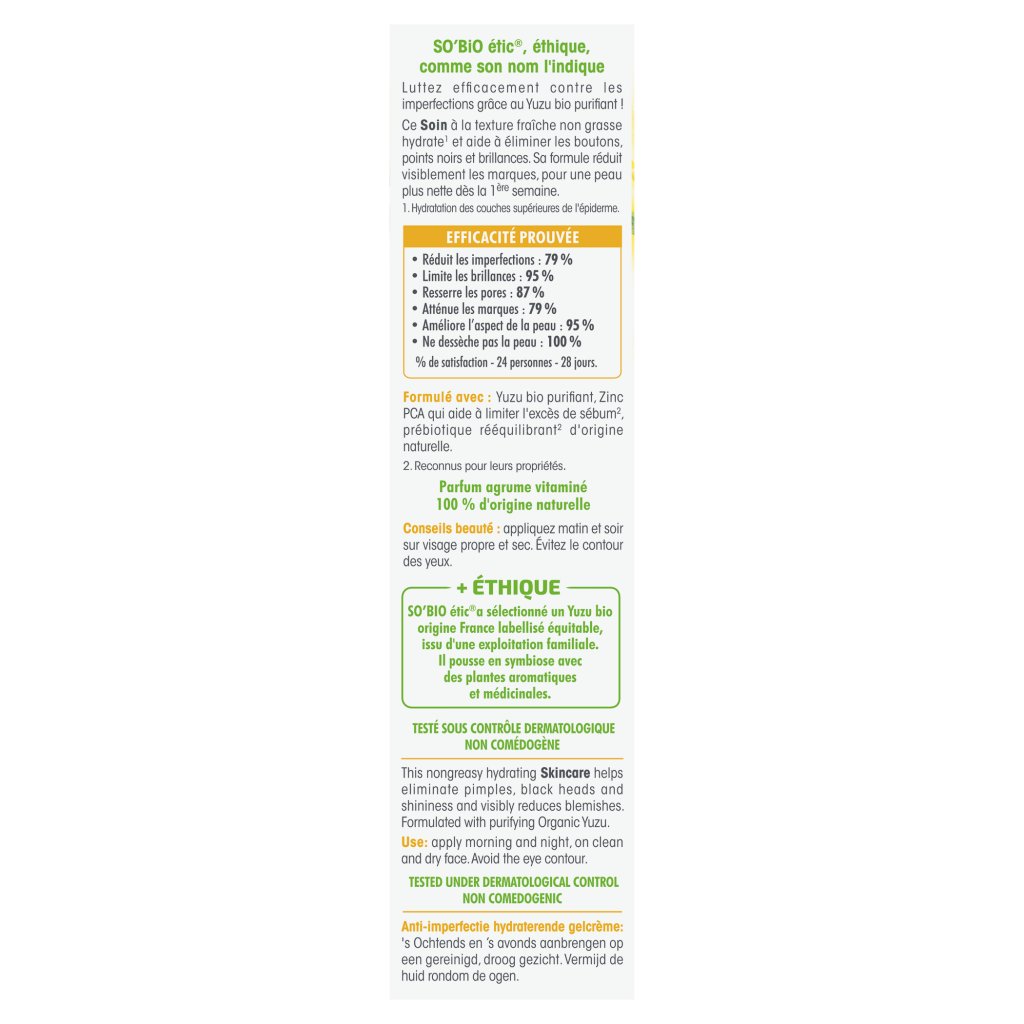 Hydratační gel-krém SO’BiO étic Clean Yuzu BIO nabízí jemnou a lehkou texturu, perfektní pro mastnou pleť se sklonem k nedokonalostem. Díky přírodnímu bio yuzu, zinku PCA a prebiotickým složkám efektivně pomáhá redukovat pupínky i černé tečky, minimalizuje nadbytek kožního mazu a zanechává pokožku čistší už za první týden používání. Svěží citrusová vůně spolu s šetrným složením bez silikonů dodají pleti komfort a pocit přirozené péče. Používejte ráno i večer na vyčištěnou pleť. Certifikováno Ecocert Cosmos Organic.