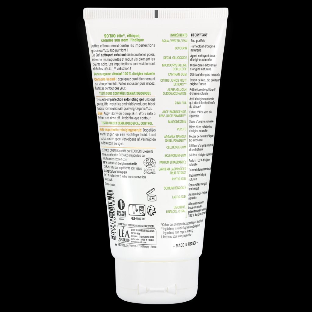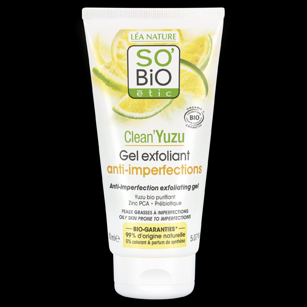 SO’BiO étic exfoliační gel Clean Yuzu BIO je ideální volbou pro péči o mastnou pleť s nedokonalostmi. Díky jemným přírodním peelingovým částečkám efektivně čistí pokožku do hloubky, pomáhá odstraňovat černé tečky a uvolňuje zanesené póry. Zároveň pokožku osvěžuje příjemnou vůní citrusových plodů yuzu. Dermatologicky testované složení obsahuje 99 % ingrediencí přírodního původu a disponuje bio certifikací Ecocert Cosmos Organic. Nanáší se denně na vlhkou pleť a poté smývá vodou.
