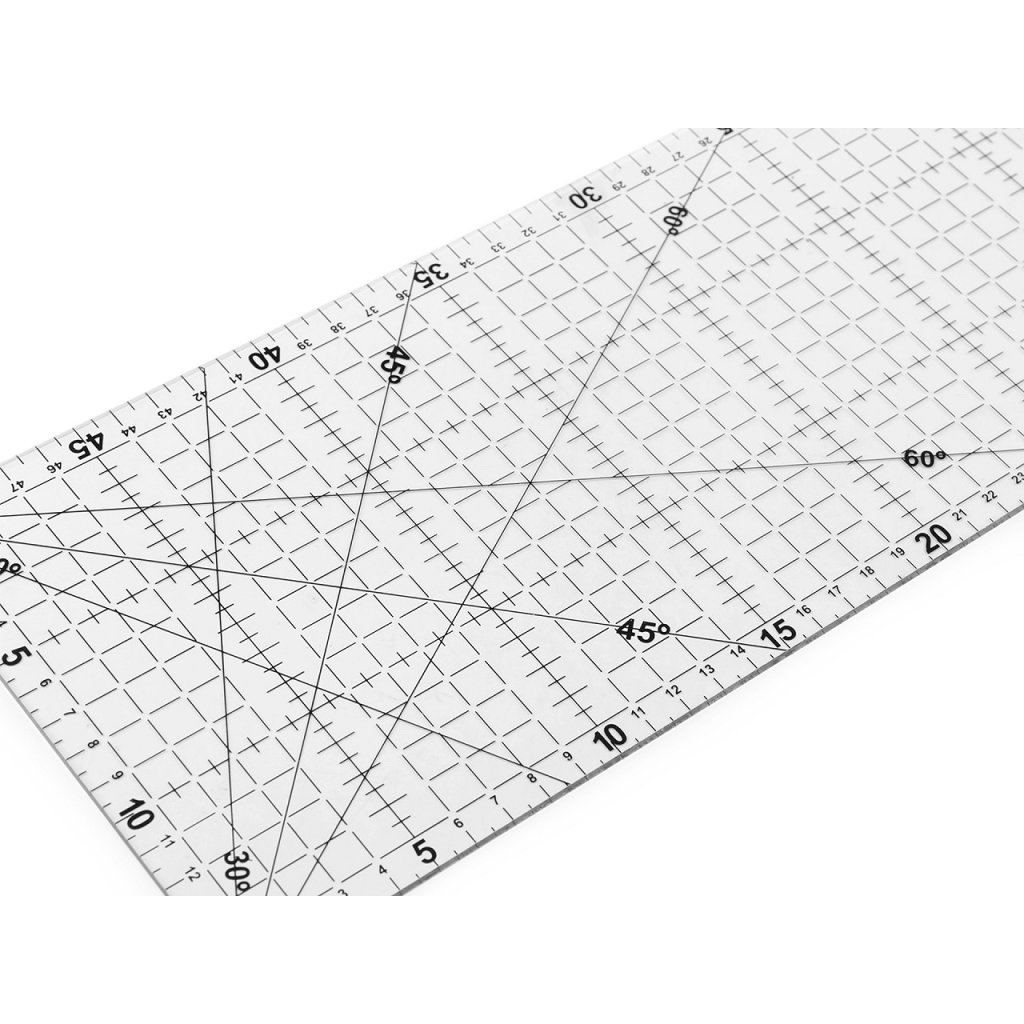 Velké plastové pravítko oceníte pro jeho univerzálnost. Je pevné, dá se využít nejen na techniku patchwork, ale i na další ruční práce jako jsou quilting, scrapbooking a šití. Vyznačené jsou hodnoty po půl cm a úhly 30°, 45° a 60°.