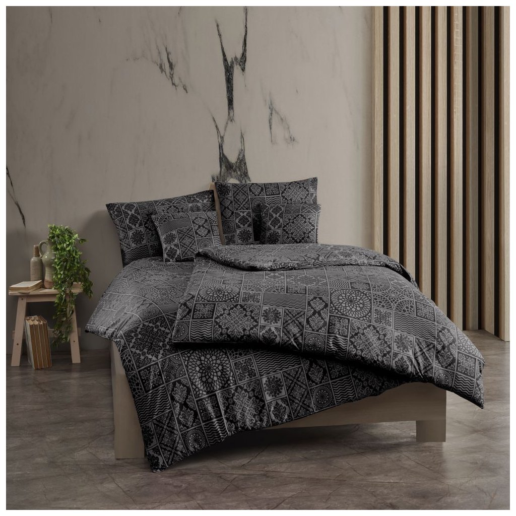 Kvalitní bavlněné povlečení typu renforcé je ideální volbou do moderní ložnice. Hebké na dotek, prodyšné a odolné – nabízí komfortní spánek po celý rok. Dodejte své ložnici styl a eleganci s povlečením Tokyo černé - francouzské povlečení s šedým geometrickým a orientálním vzorem v mozaikovém stylu.