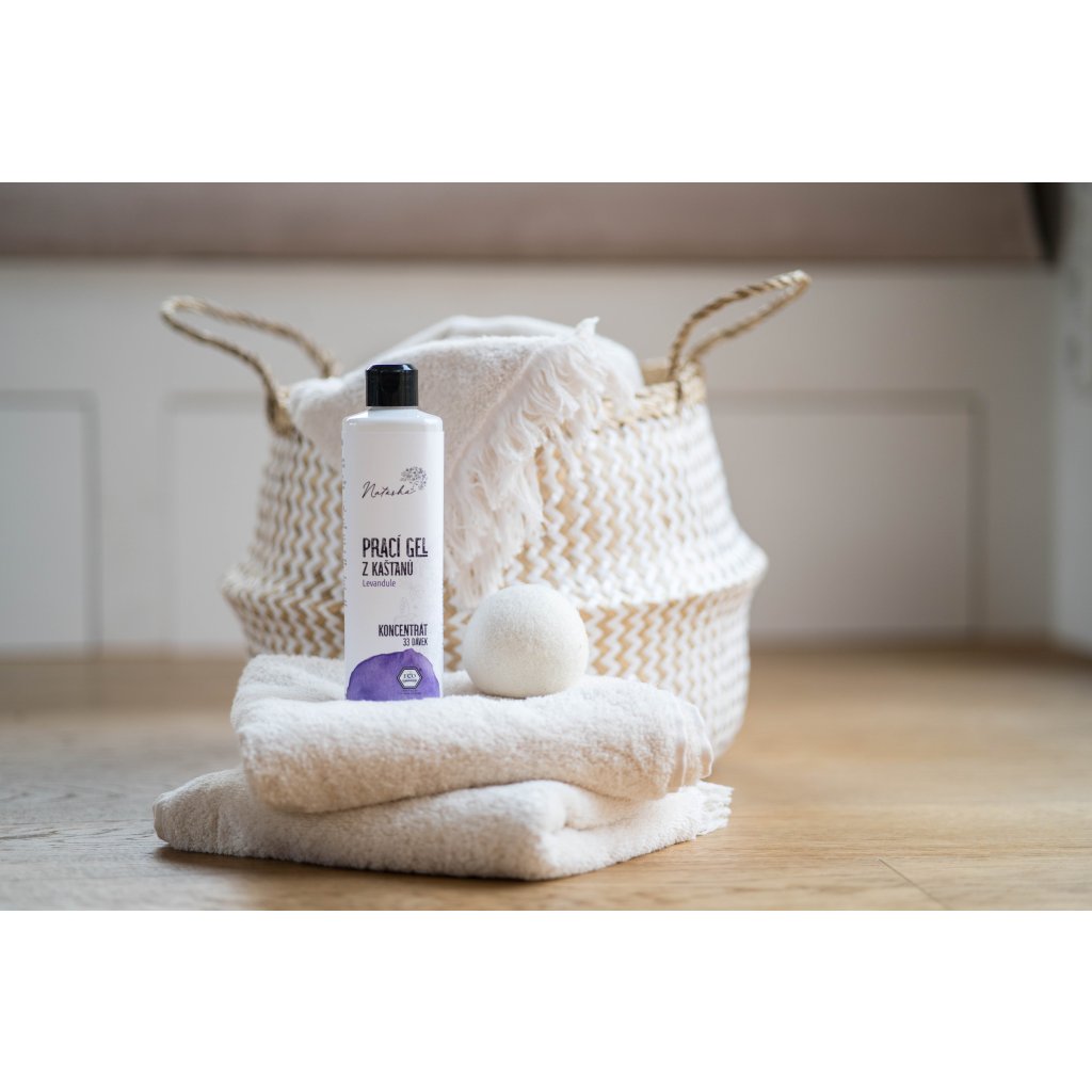 Vysoce koncentrovaný prací gel z koňských kaštanů je skvělý pro šetrné praní přírodních i syntetických materiálů. Poradí si s barevným i bílým prádlem, a to včetně látkových plen. Prát můžete v pračce, v ruce i v přírodě – gel je 100% biologicky rozložitelný a rozumí si i s domácími čističkami vod. Díky šetrnému složení je vhodný i pro citlivou pokožku. Prádlo gel na praní příjemně provoní esenciálním olejíčkem z levandule.. PROKLEPNUTO: Jak se saponiny z kaštanů poperou s nečistotami a zatuchlým prádlem? Prací gel Natasha na vlastní prádlo prubla naše testerka a podělila se o zkušenosti dojmy v upřímné recenzi na blogu, mrkejte – dozvíte se tam třeba, jestli 8 ml gelu zvládne vyprat kupu špinavého prádla.. [[8veciprani]]