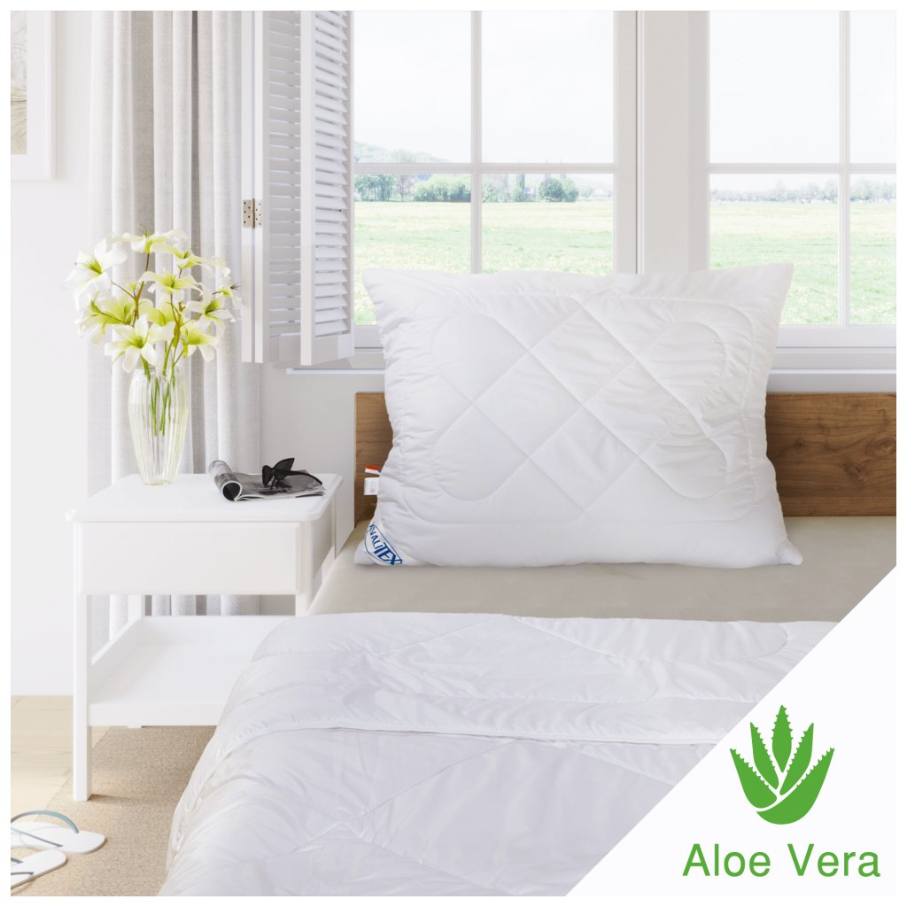 Přikrývky a polštáře Aloe vera jsou vyrobeny naší českou výrobou značky Kvalitex. Mikrovlákenná tkanina obsahuje výtažek z Aloe vera (Aloe pravá), která má na pokožku zákazníka změkčující vliv. Přikrývky i polštáře jsou vhodné pro alergiky a to díky použití vysoce kvalitních dutých vláken a velmi snadné údržbě konečného zákazníka.
