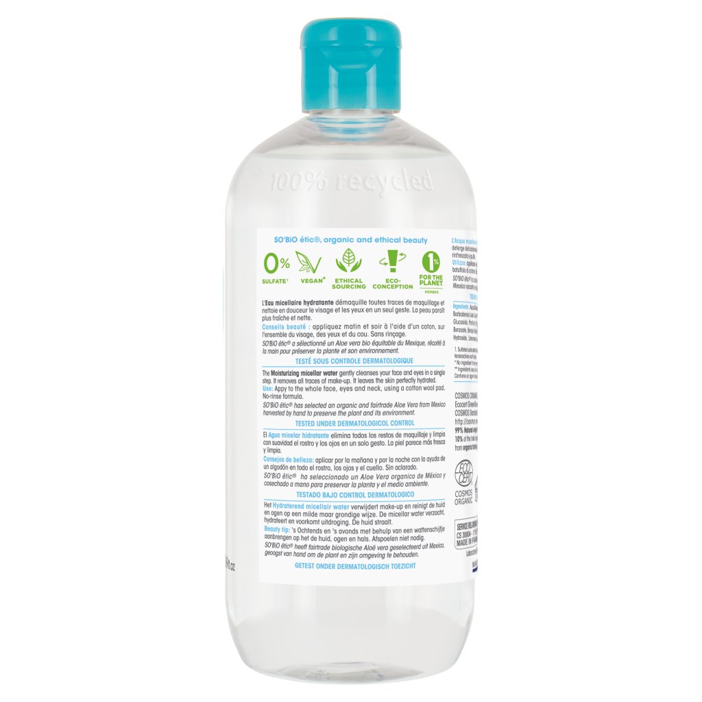 Hydratační micelární voda SO’BiO étic s BIO aloe vera jemně a šetrně odstraňuje make-up a nečistoty z obličeje i očí, a přitom pleť nijak nedráždí ani nevysušuje. Díky pečlivě vybrané kombinaci přírodních složek, jako je rostlinná voda z chrpy a čistá šťáva z aloe vera, pokožku krásně zklidní, osvěží a poskytne jí hloubkovou hydrataci. Příjemná jemná vůně s tóny zeleně a citrusů dodává péči svěží, přirozený rozměr. Stačí jednoduše nanést na vatový tampon a jemně setřít, bez potřeby oplachování.