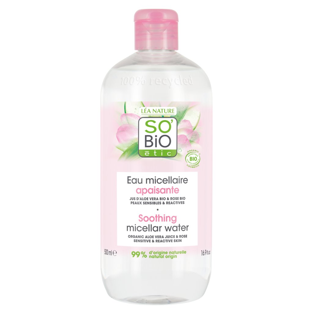 SO’BiO étic micelární voda s extraktem z Aloe Vera v BIO kvalitě je perfektní volbou pro každodenní šetrné čištění citlivé a reaktivní pleti. Díky jemnému složení bez silikonů pleť snadno zbaví nečistot i make-upu z obličeje, očí a rtů. Po aplikaci je pokožka hydratovaná, příjemně zklidněná a svěží, bez pocitu vysušení či podráždění. Tento přírodní produkt certifikovaný Ecocert Cosmos Organic obsahuje 99 % složek přírodního původu a jemnou vůni s tóny hyacintu a růže.