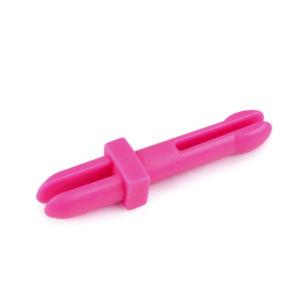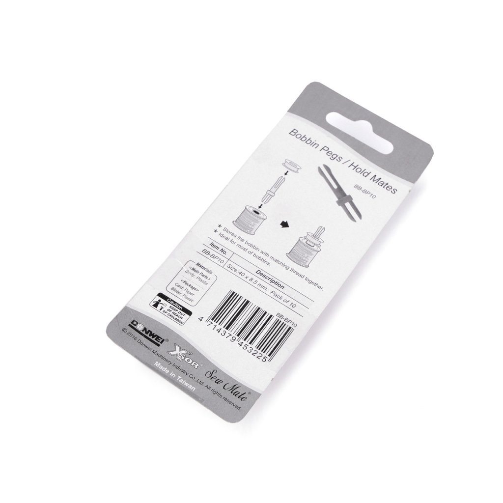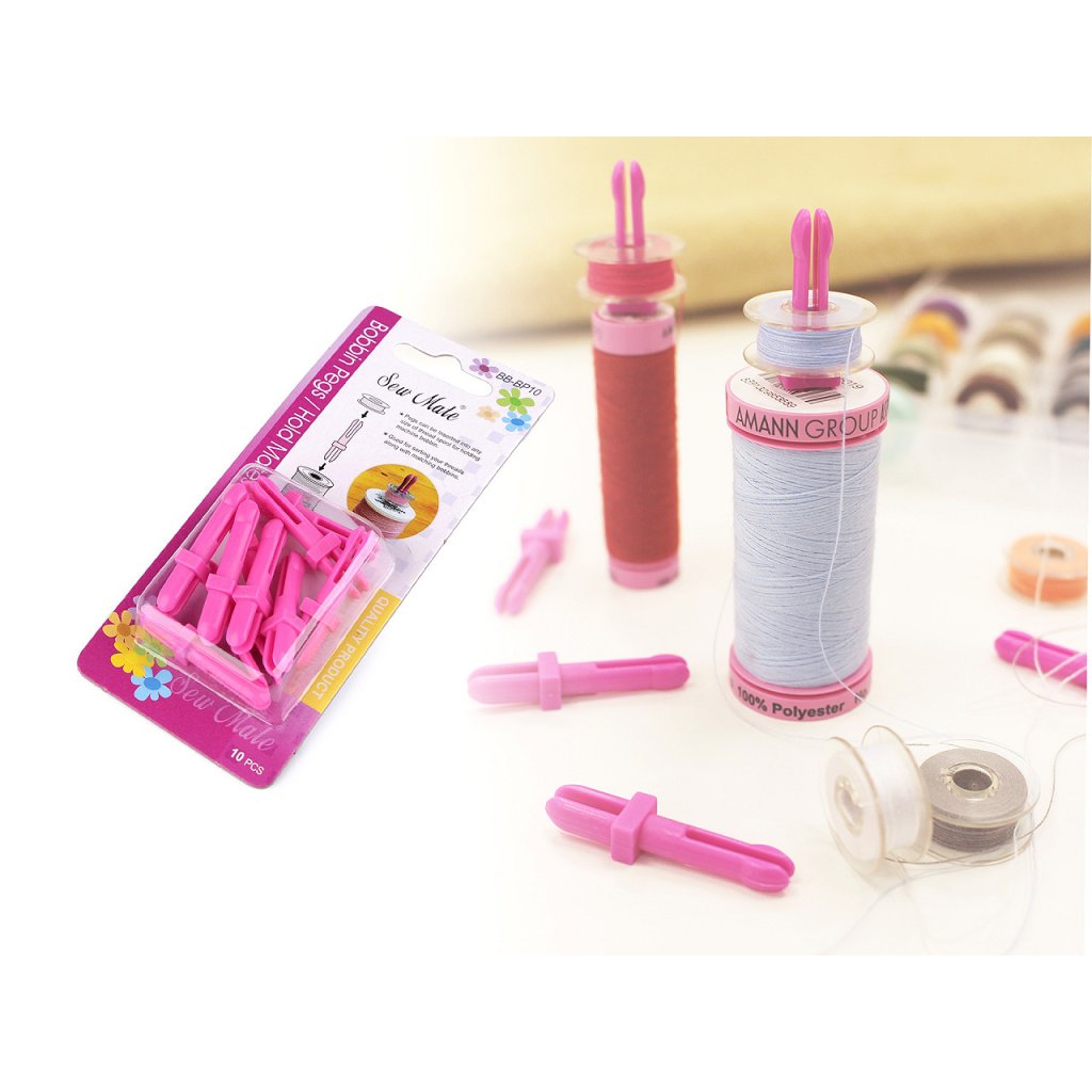 Plastový držák je šikovný pomocník na skladování cívek. Do delší části nasunete cívku (1 nebo 2 ks) a kratší část nasunete na nit. Tak budete mít přehledně pohromadě cívky s celými nitěmi.