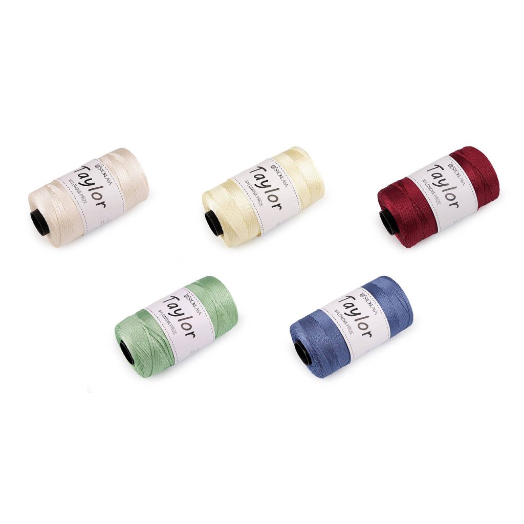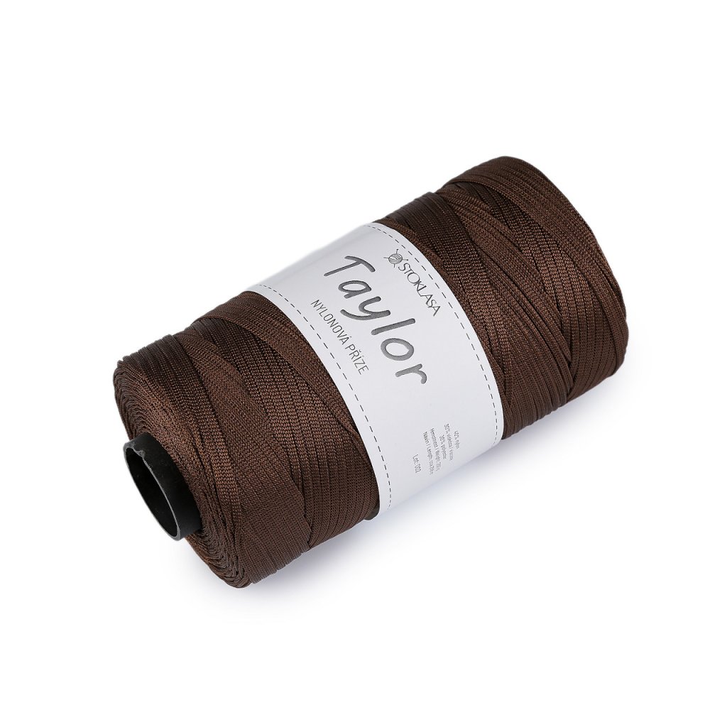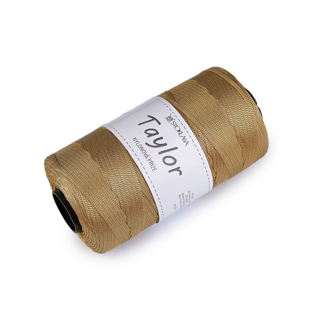 Pletací příze Taylor je plochá a připomíná provázek. Jemně se leskne. Využijete ji na pletení a háčkování tašek, košíků a podobných výrobků.