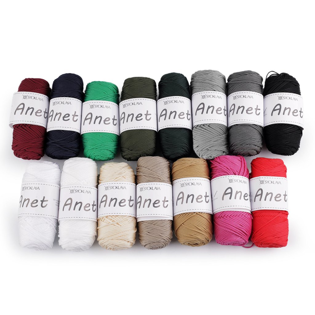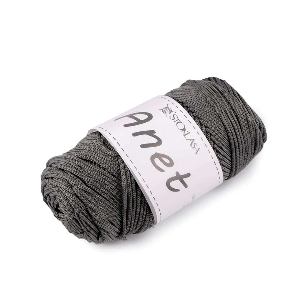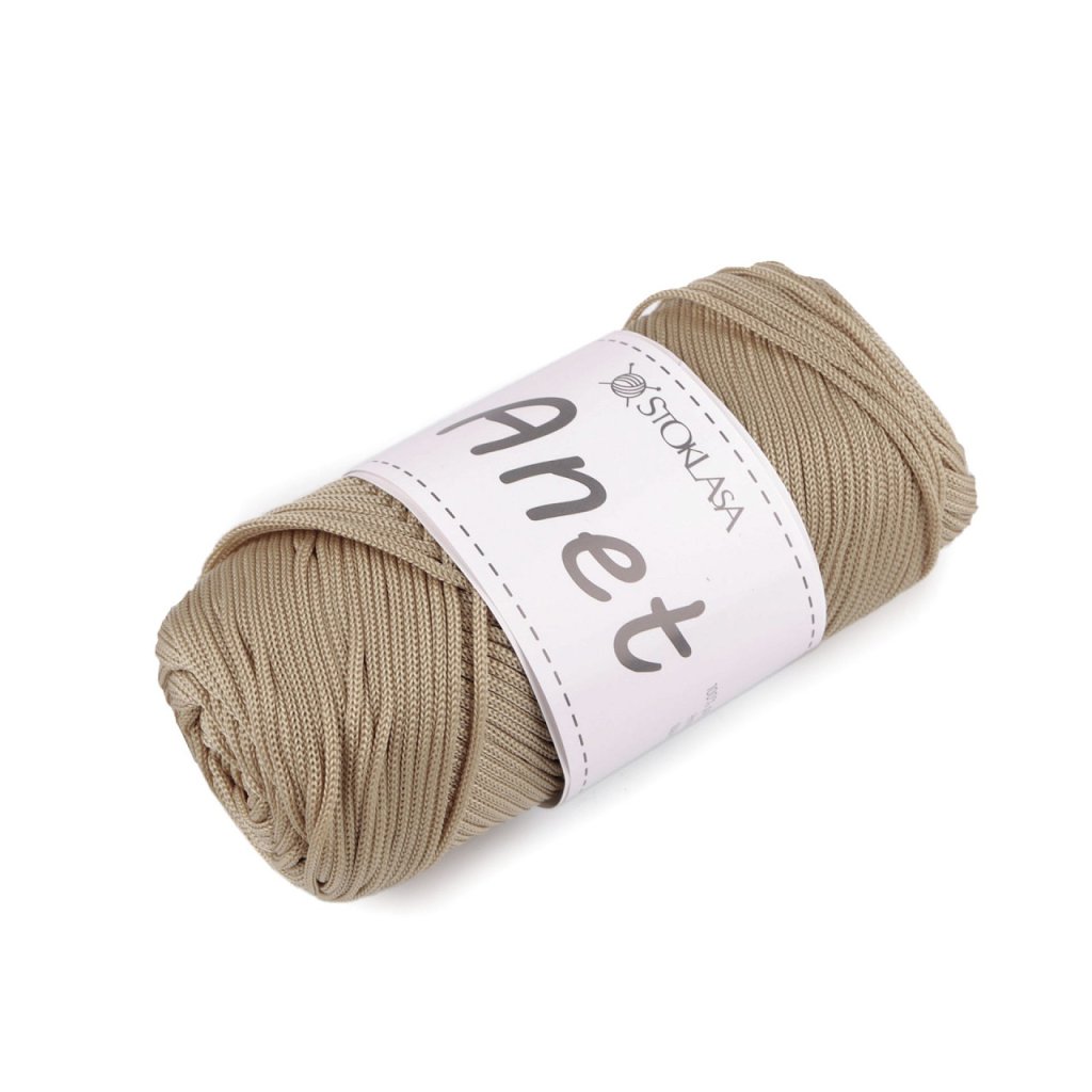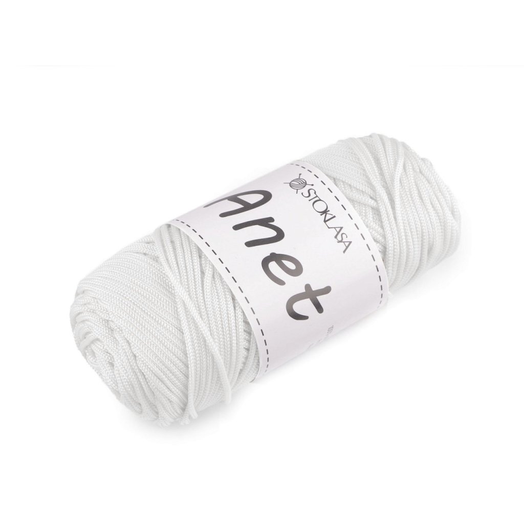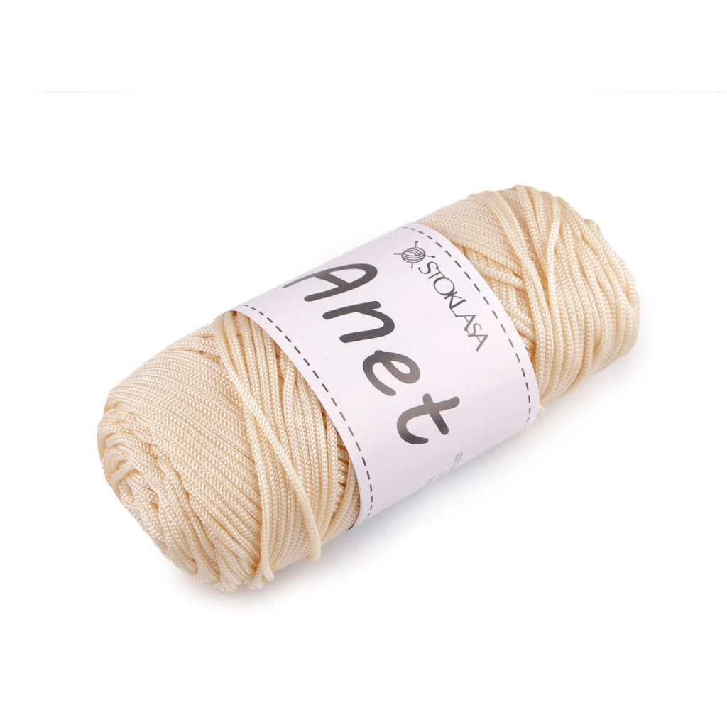 Pletací příze Anet připomíná provázek a má jemně lesklý povrch. Hodí se na pletení a háčkování tašek, košíků a podobných výrobků i na techniku macrame.