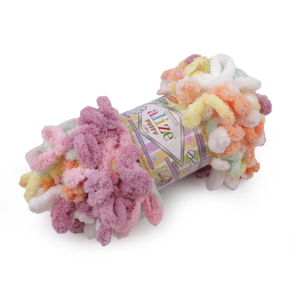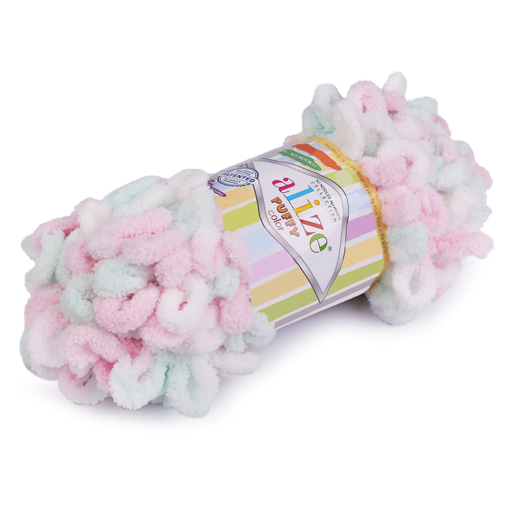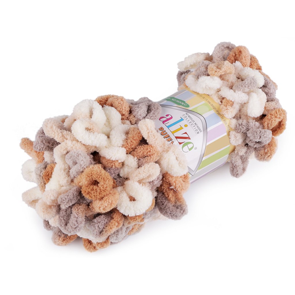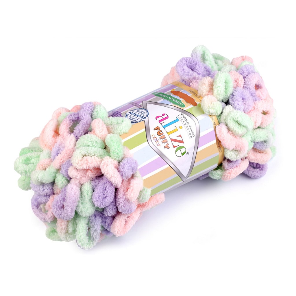 Příze Alize Puffy color je měkká, chlupatá žinylková příze s velkými očky. Tvoří nádherné barevné přechody. Na pletení nepotřebujete jehlice ani háček - proplétají se jednotlivá očka. Je vhodná na pletení dek, šálů apod.