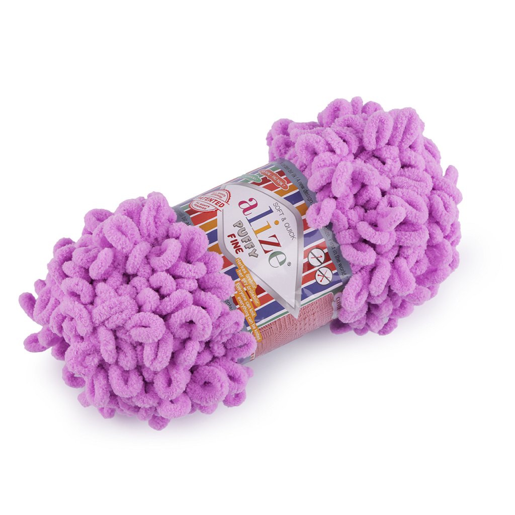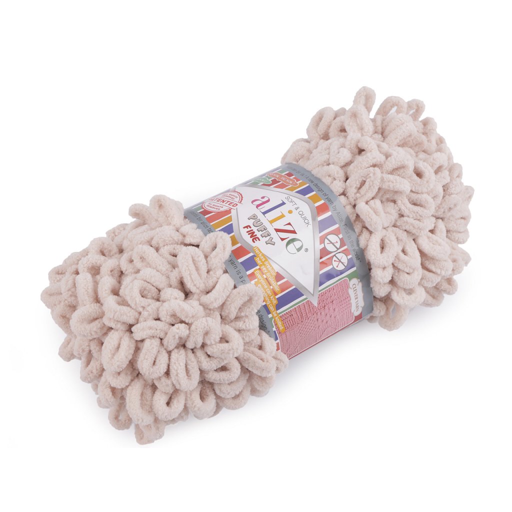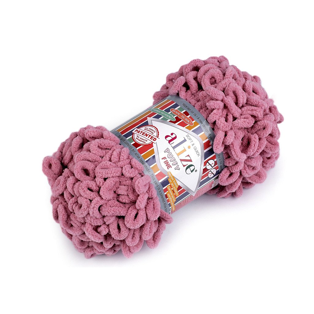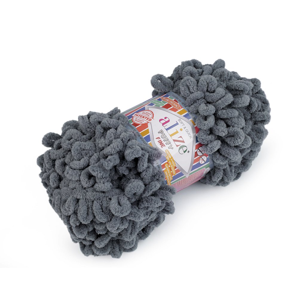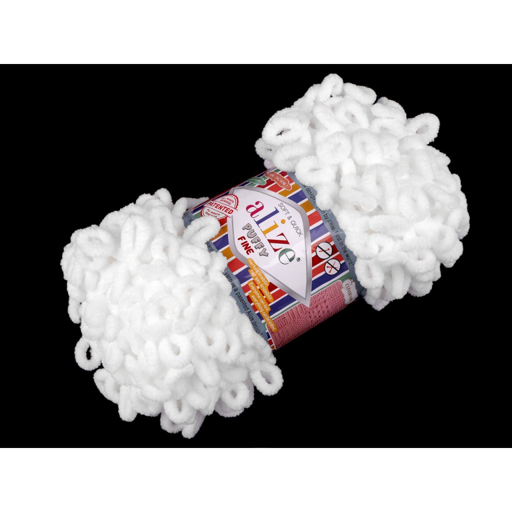 Příze Alize Puffy Fine je měkká, chlupatá žinylková příze s velkými očky. Na pletení nepotřebujete jehlice ani háček - proplétají se jednotlivá očka. Je vhodná na pletení dek, šálů apod.