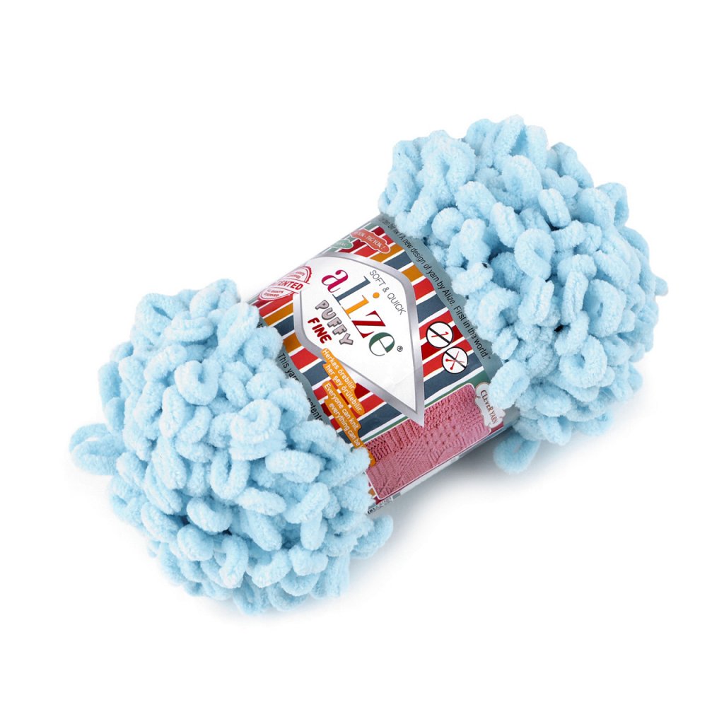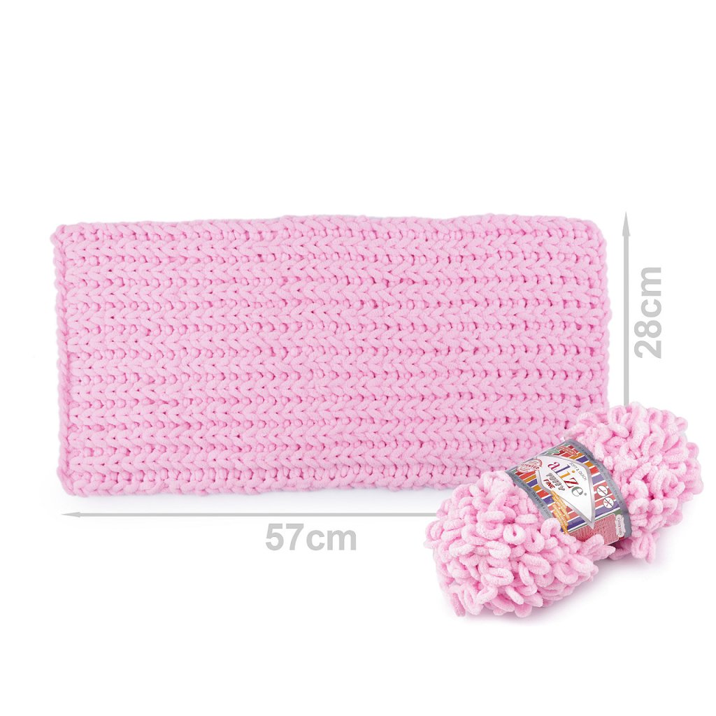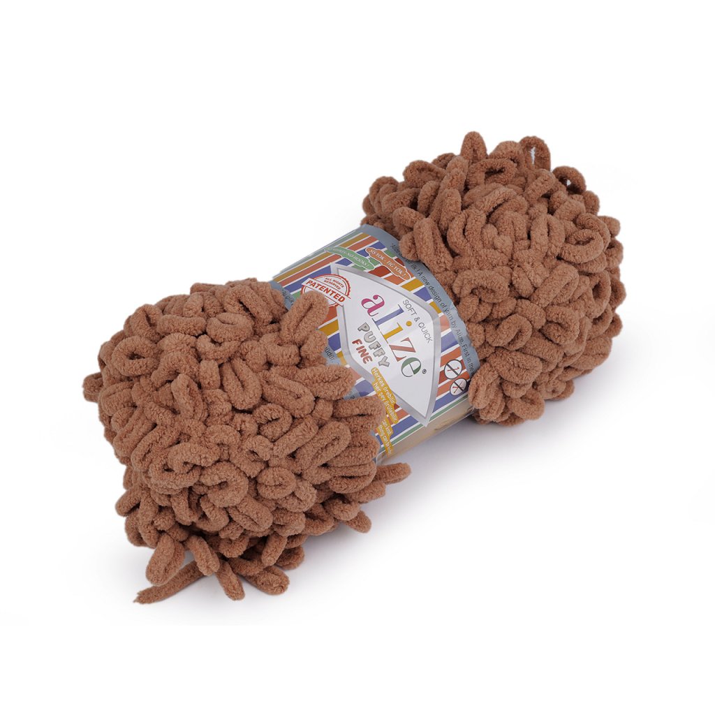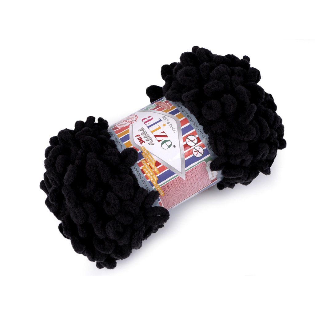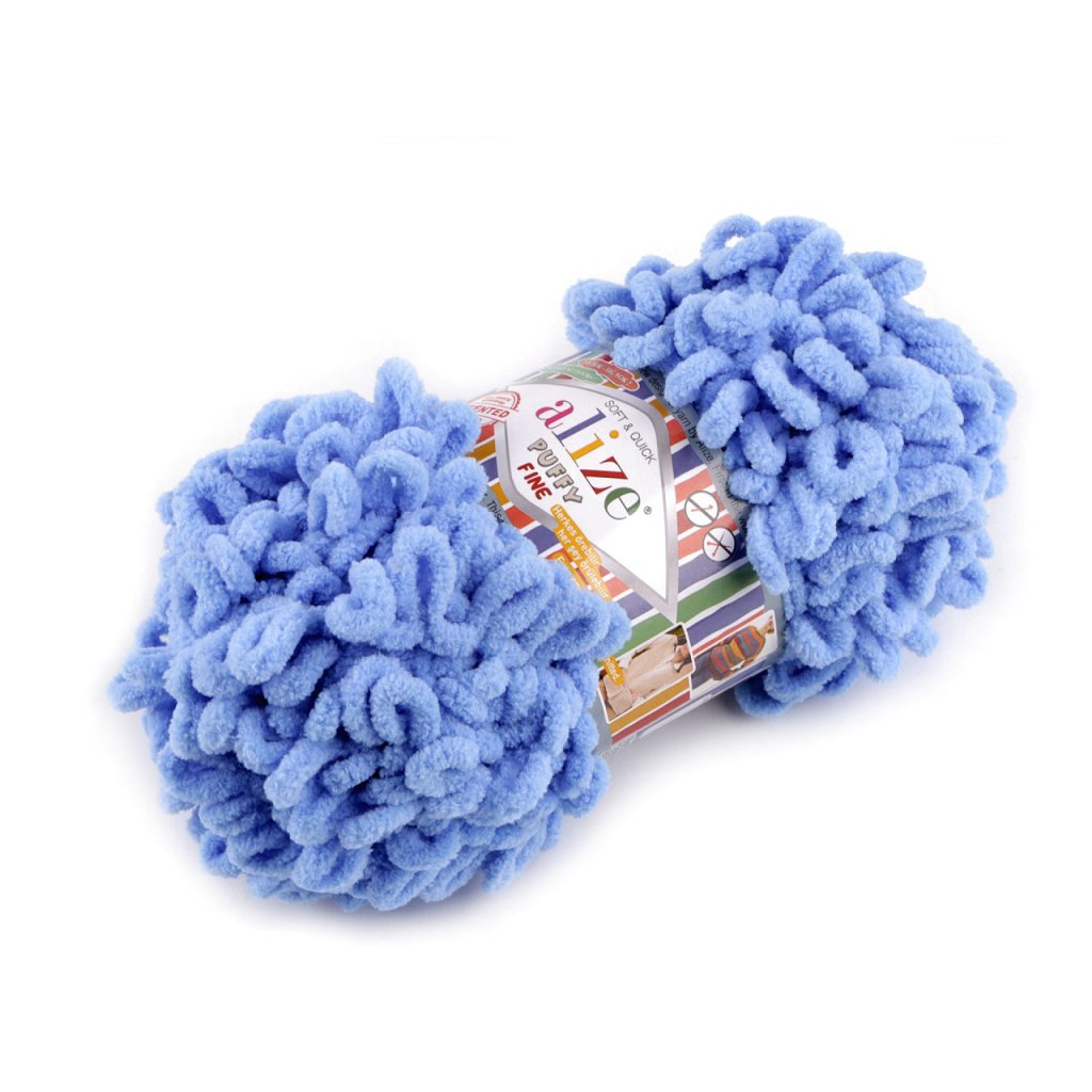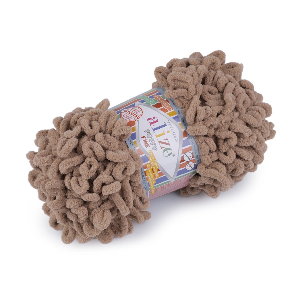 Příze Alize Puffy Fine je měkká, chlupatá žinylková příze s velkými očky. Na pletení nepotřebujete jehlice ani háček - proplétají se jednotlivá očka. Je vhodná na pletení dek, šálů apod.