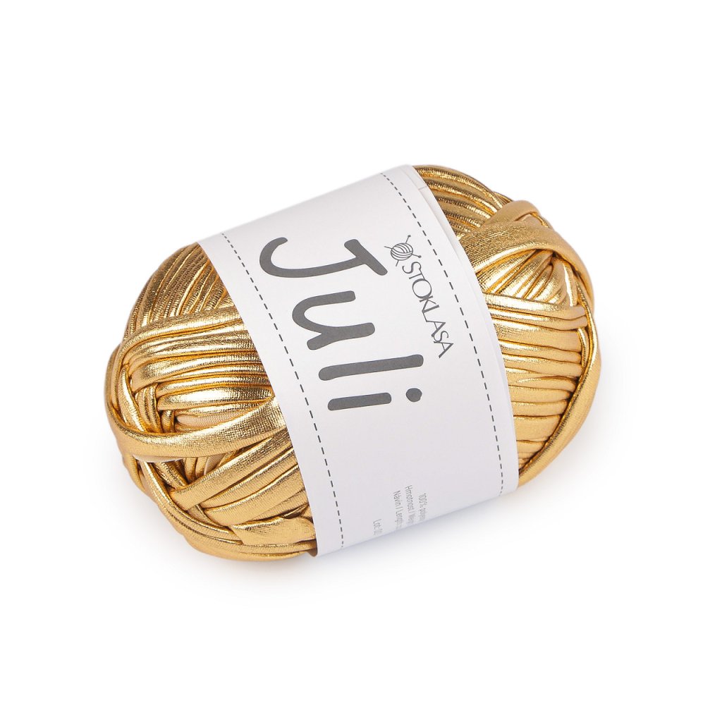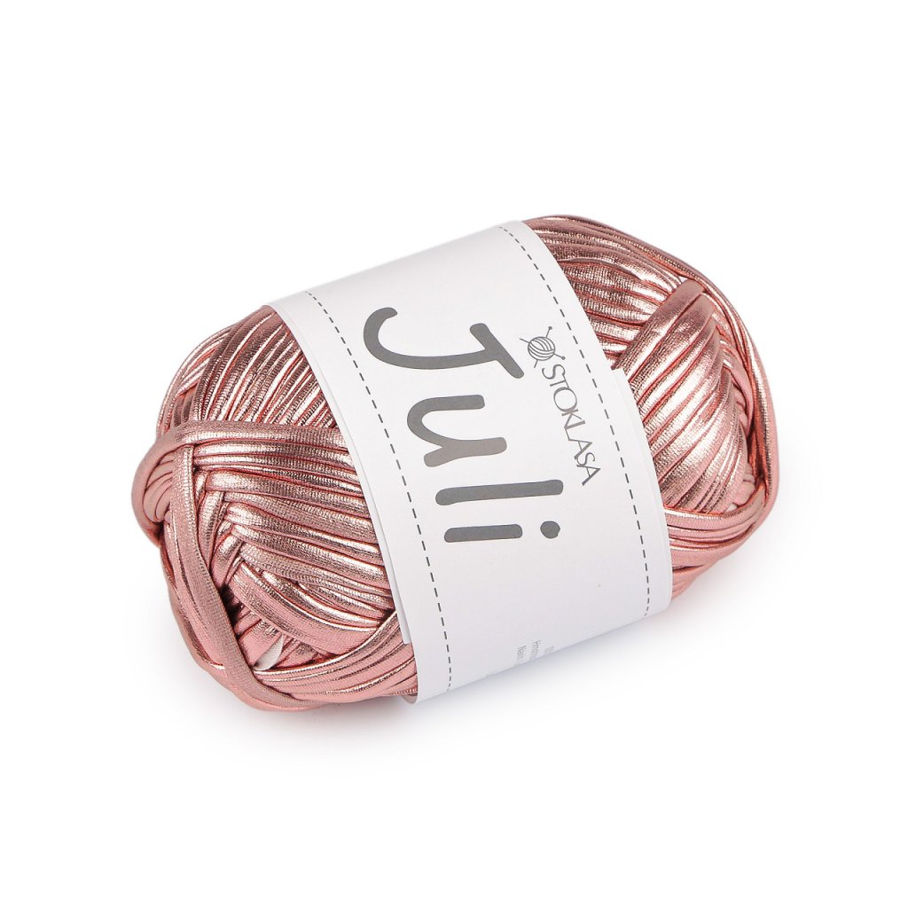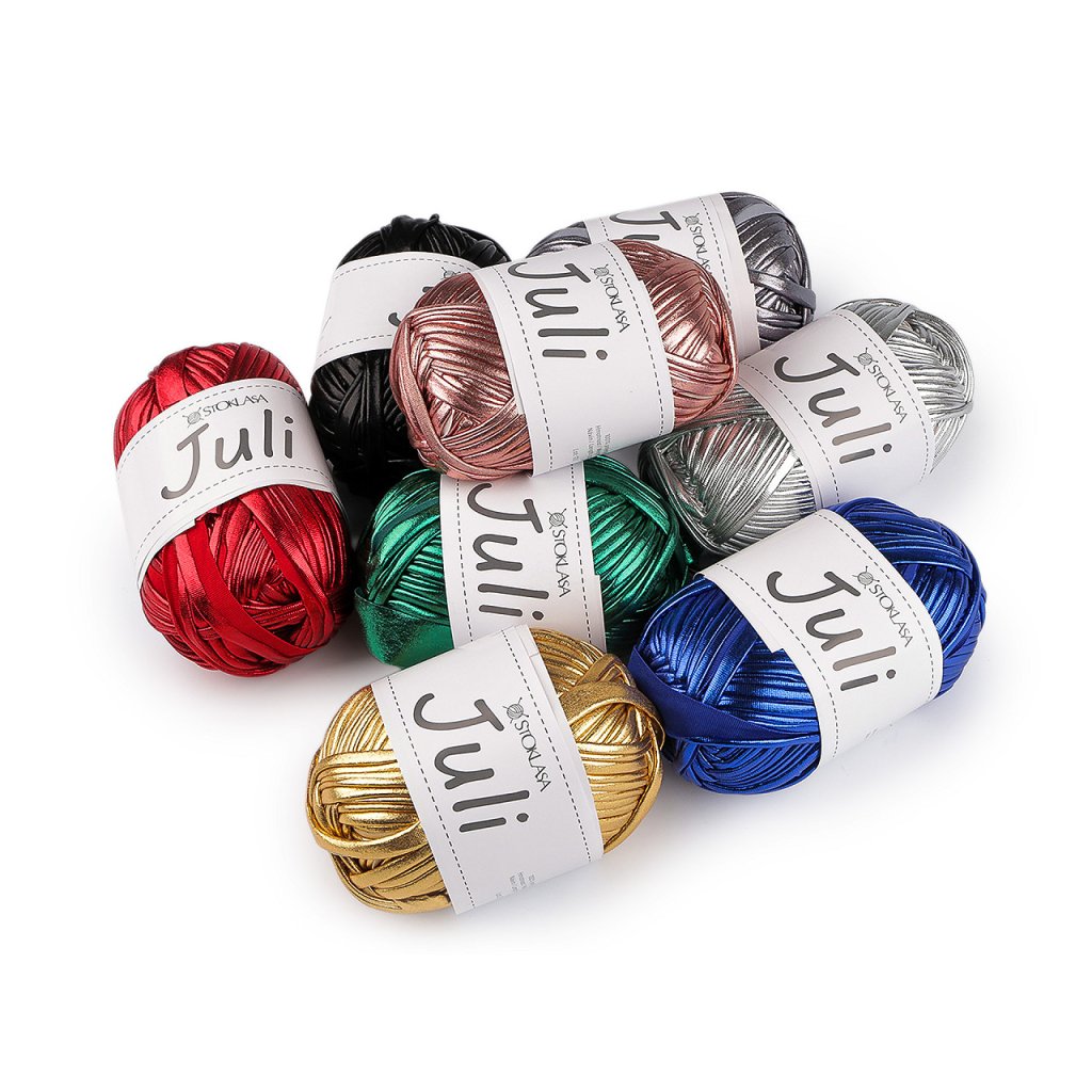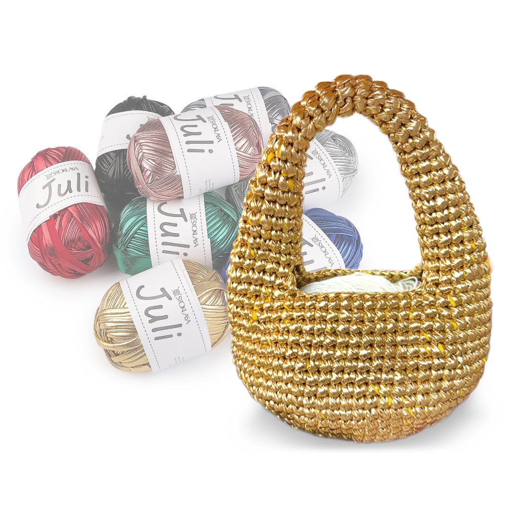Příze Juli má efektní metalický lesk, který dodá exkluzivitu každému výrobku. Příze je elastická a měkká a dobře se s ní pracuje. Můžete z ní uplést či uháčkovat kabelky, batůžky, košíčky, peněženky, ale dají se z ní tvořit i zajímavé šperky.