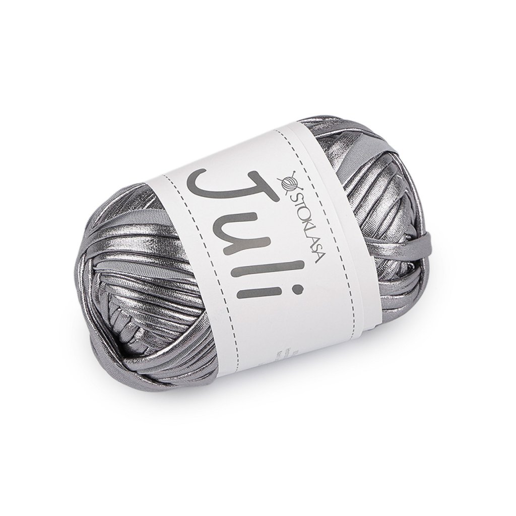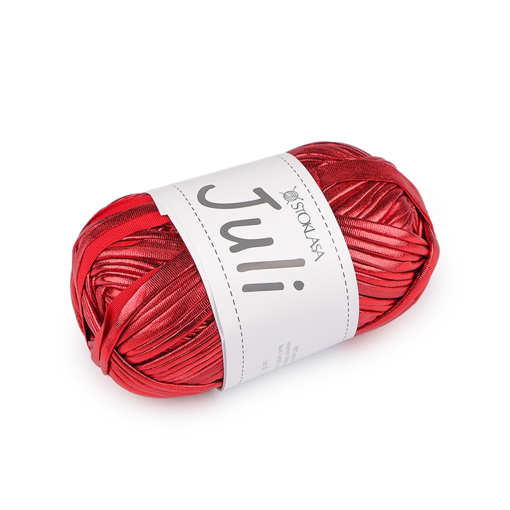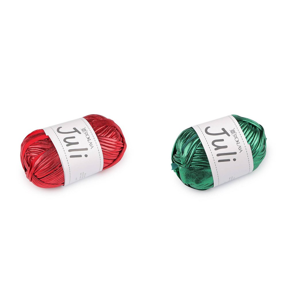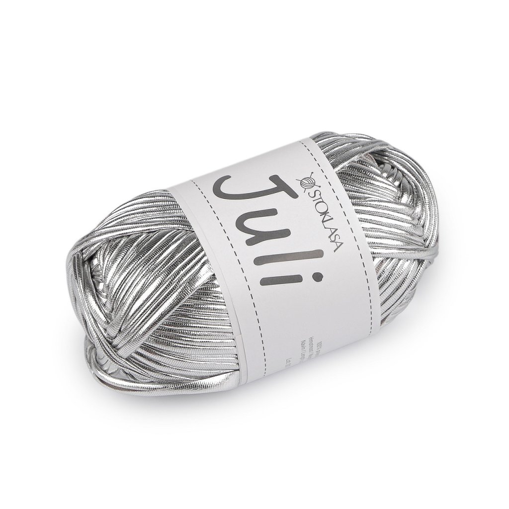 Příze Juli má efektní metalický lesk, který dodá exkluzivitu každému výrobku. Příze je elastická a měkká a dobře se s ní pracuje. Můžete z ní uplést či uháčkovat kabelky, batůžky, košíčky, peněženky, ale dají se z ní tvořit i zajímavé šperky.