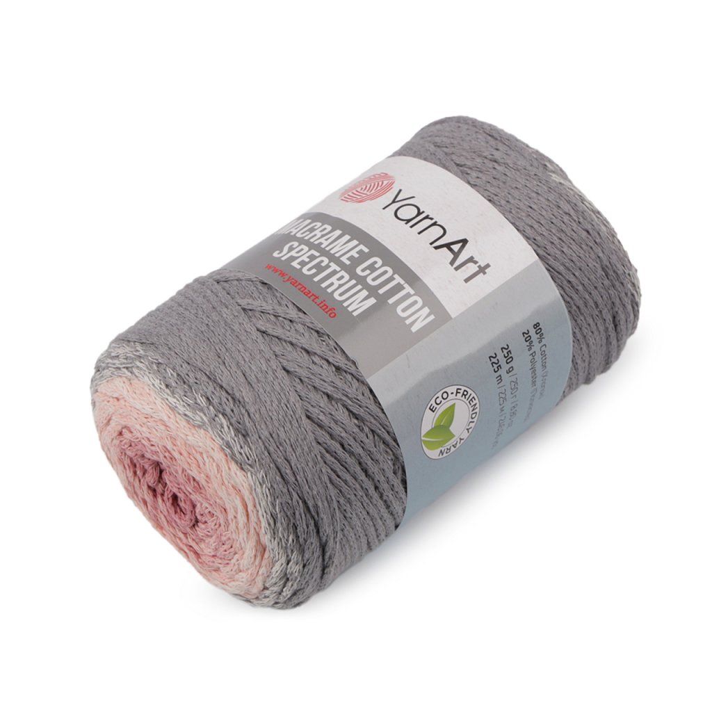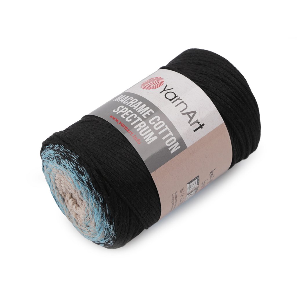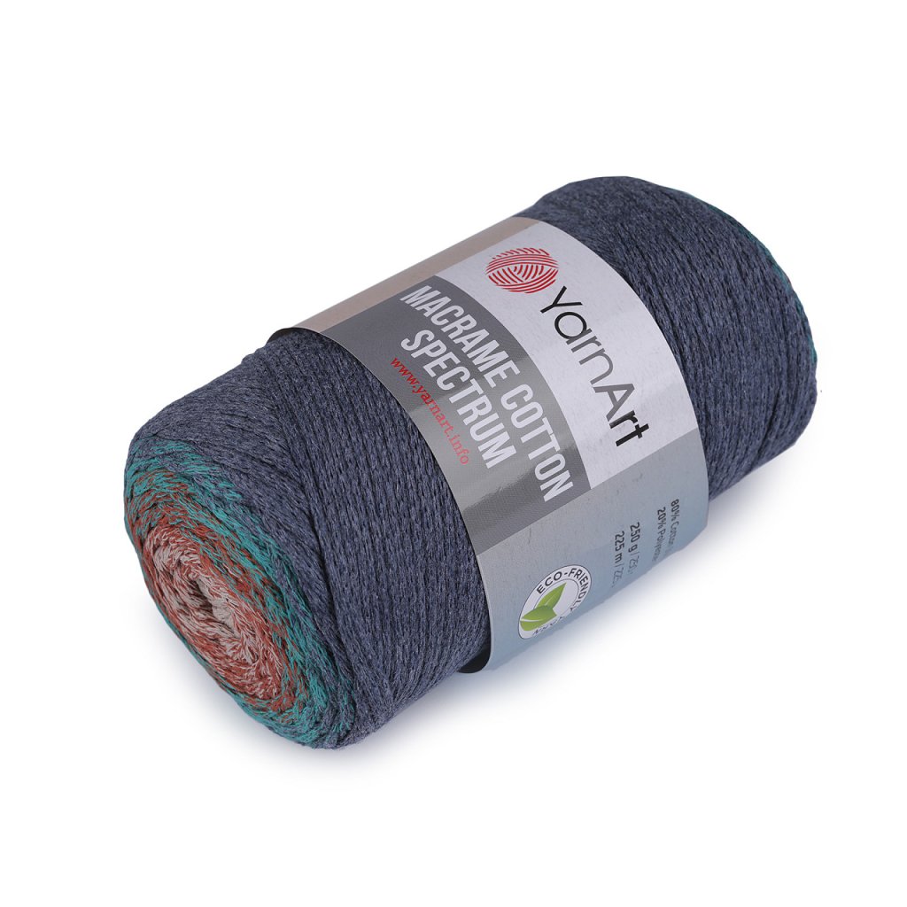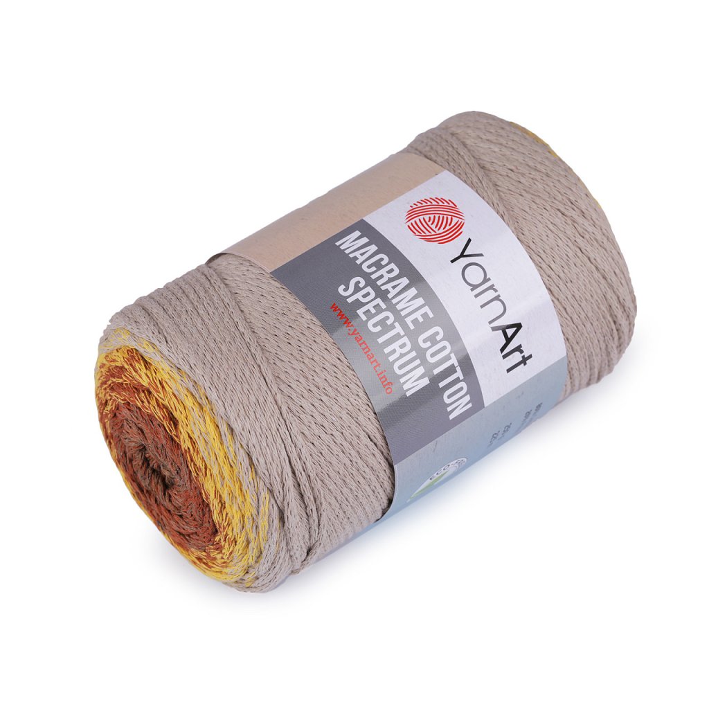 Příze Macrame Cotton Spectrum připomíná provázek. Je zajímavá svými barevnými přechody, se kterými budou všechny výrobky vypadat originálně. Využijete ji na pletení nebo háčkování pufů, košíků, koberečků i tašek, kde úžasně vyniknou její duhové přechody barev.