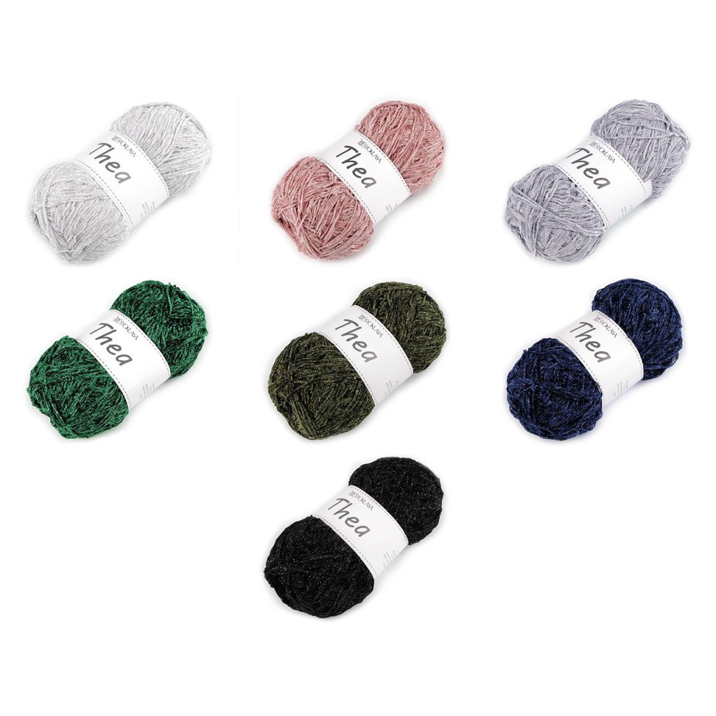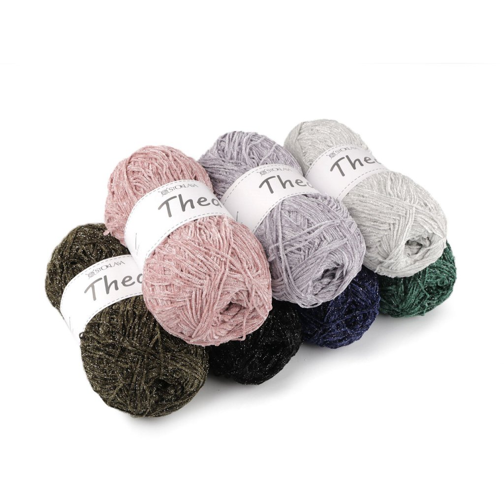Žinylková příze Thea je protkaná třpytivým lurexem, který jí dodává jiskru. Můžete z ní uplést či uháčkovat různé dekorace, postavičky i doplňky.