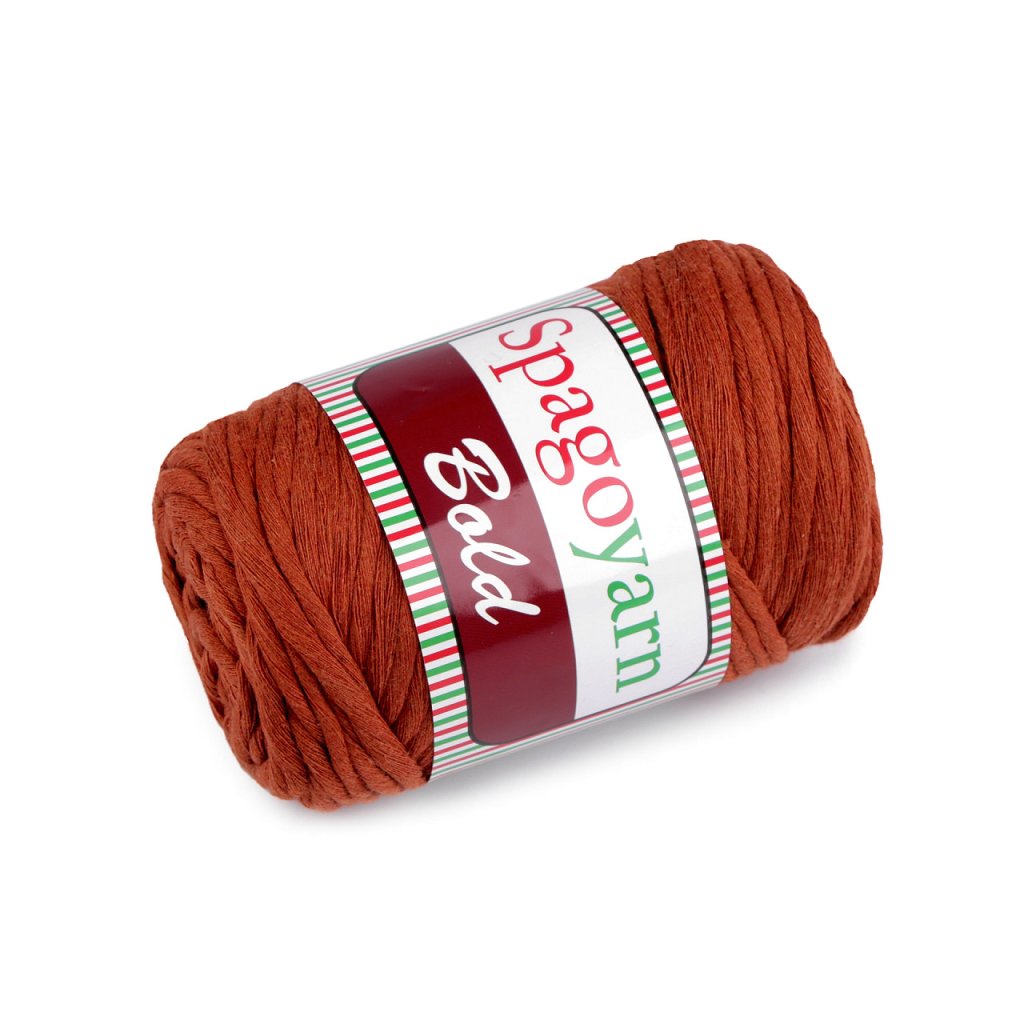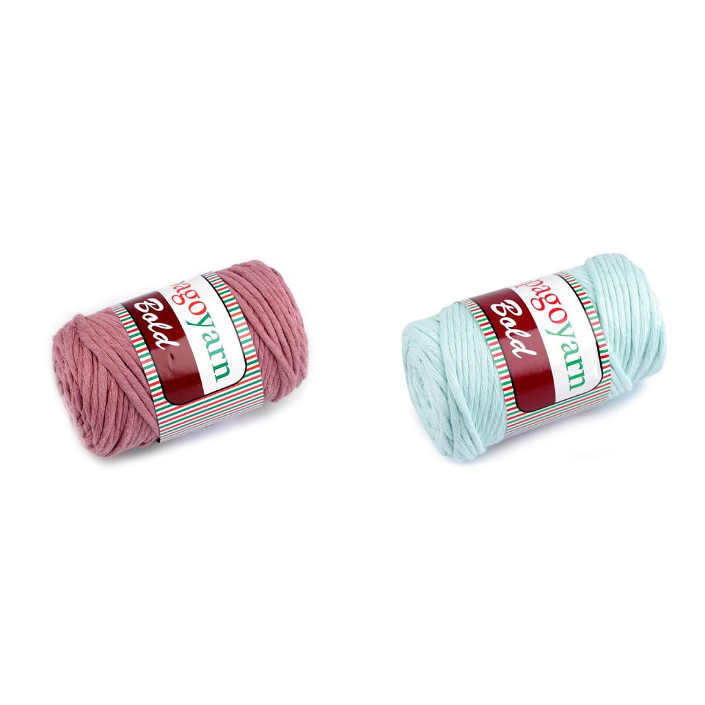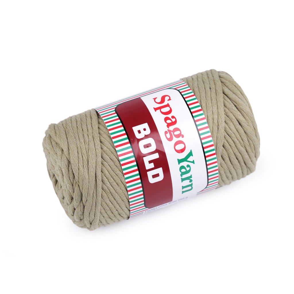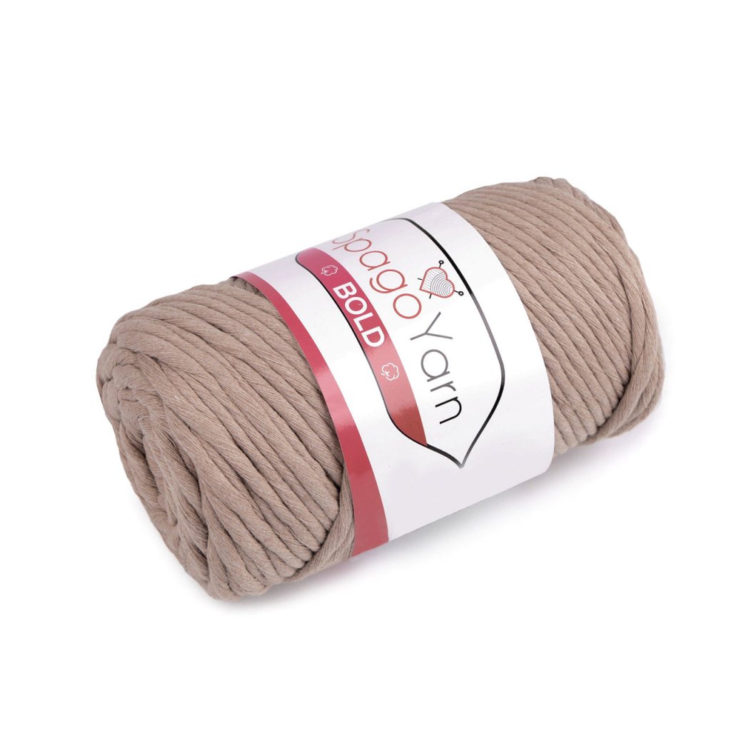 Bavlněná pletací příze Spagoyarn Bold je volně stočená špagátová příze, kterou využijete na pletení a háčkování koberečků, tašek, kabelek a jiných různých doplňků. Díky svému provedení je ideální na techniku macramé (drhání). Skvěle se s ní pracuje a dá se hezky rozčesat. Můžete z ní vyrobit různé interiérové doplňky nebo závěsné dekorace.