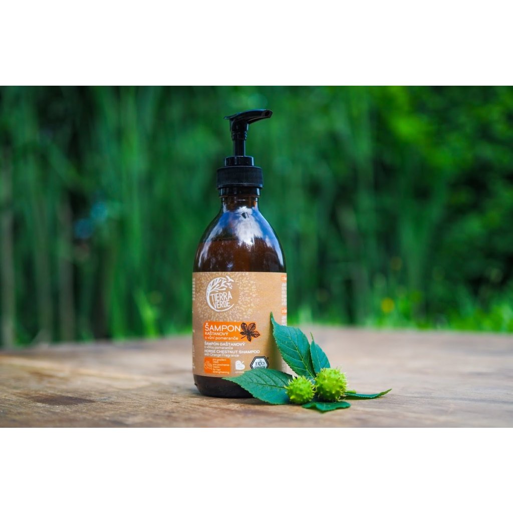 Pečující šampon na bázi výtažku z mýdlových ořechů a jemných tenzidů z kokosového oleje si oblíbí především slabé a namáhané vlasy. Extrakt z BIO kaštanů ze zámecké zahrady ve Slavkově zlepšuje prokrvení vlasové pokožky, působí proti vypadávání vlasů a hřívu celkově posiluje. Díky optimálnímu pH nevysušuje pokožku hlavy a vlasy zanechá sladce voňavé po pomeranči. Svou kvalitou a šetrností si šampon vysloužil certifikaci Eco Garantie, syntetické parfémy, barviva či dráždivé tenzidy v něm tedy budete hledat marně. A balený je ve skle!