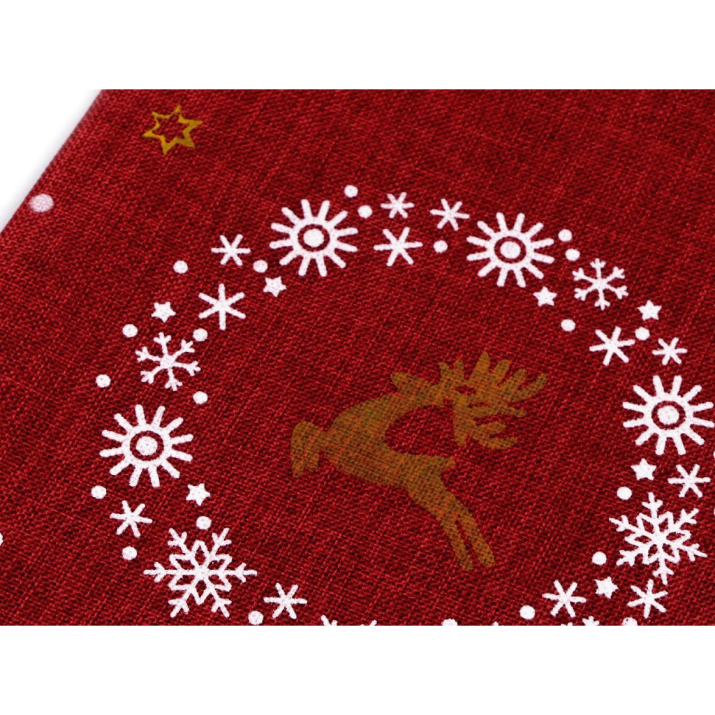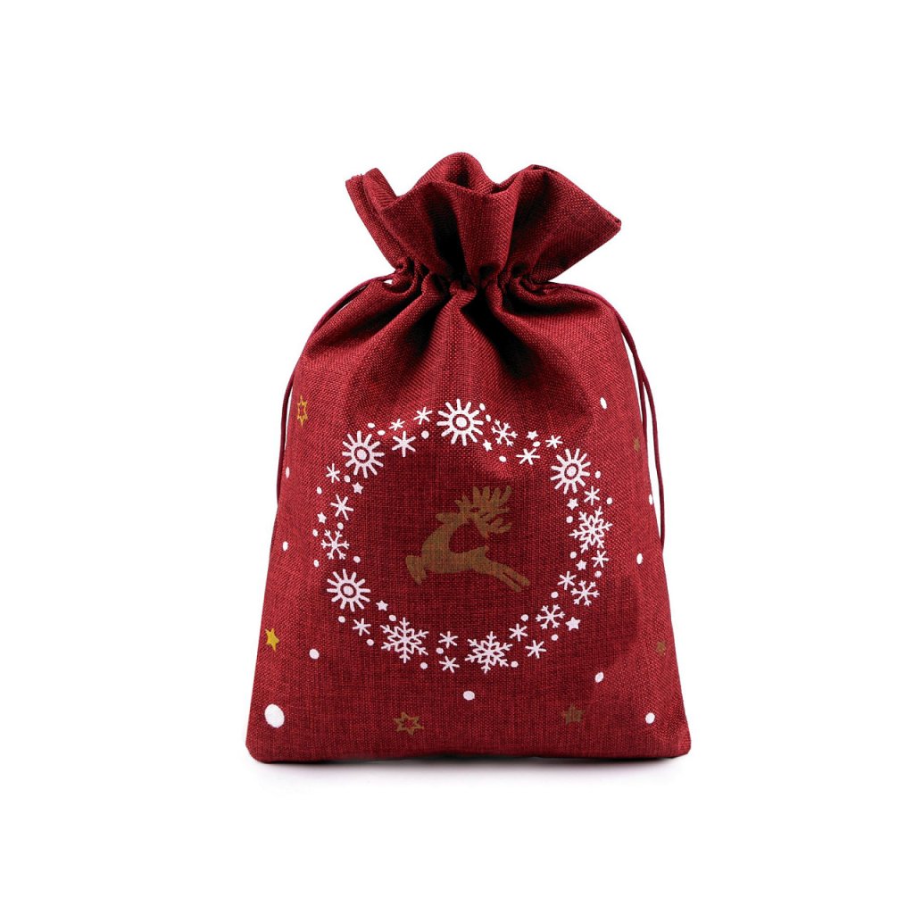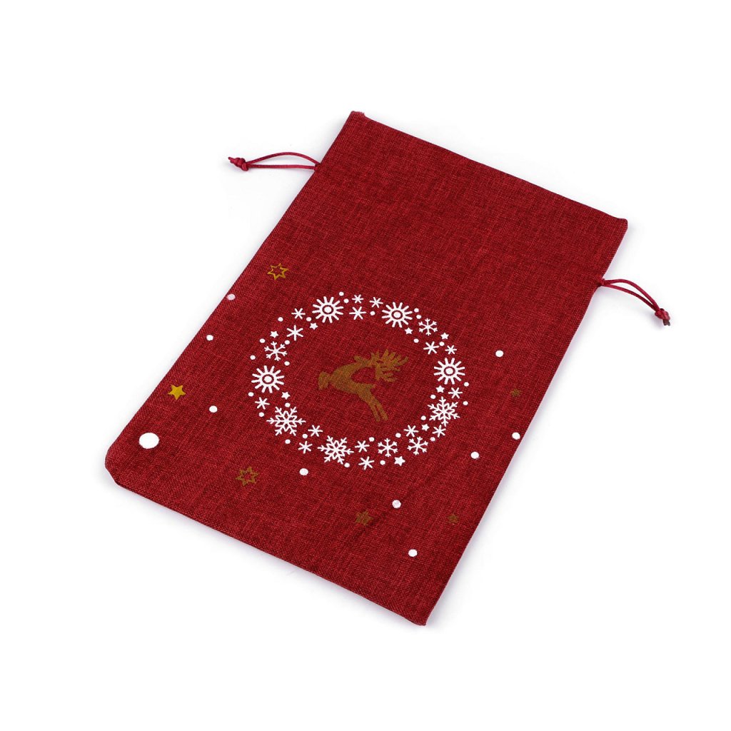 Pytlík s vánočním motivem soba a vloček má zajímavý materiál, který imituje jutu. Je pevný a kvalitní, pohodlně se uzavírá pomocí stahovacích saténových šňůrek. Můžete ho použít na dárky nebo ho naplnit mikulášskou nadílkou. Dá se naaranžovat jako vánoční dekorace.