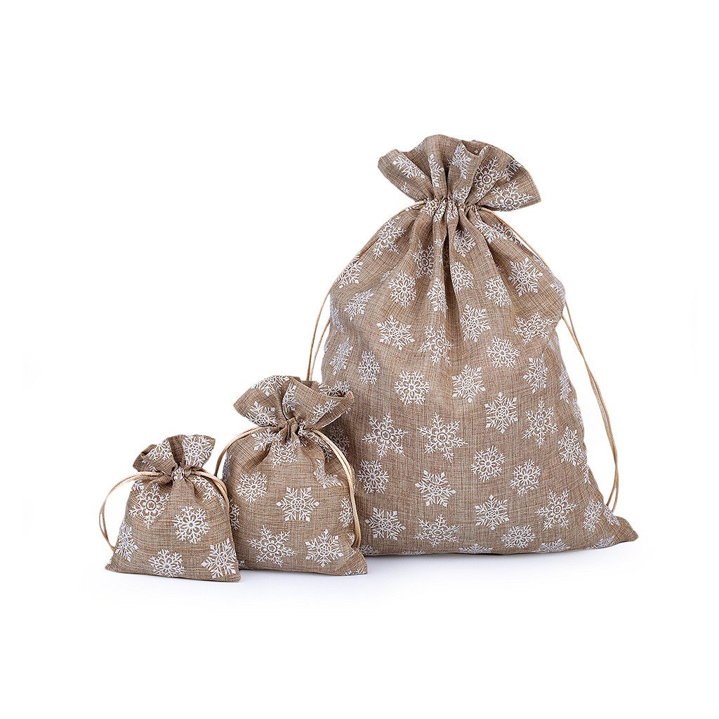 Dárkový pytlík s potiskem vloček připomíná svým zpracováním jutu. Potisk je jemně ozdobený třpytivými glitry. Pytlík se stahuje pomocí saténových šňůrek. Můžete do něj schovat drobné dárky nebo jej použít jako vánoční dekoraci.