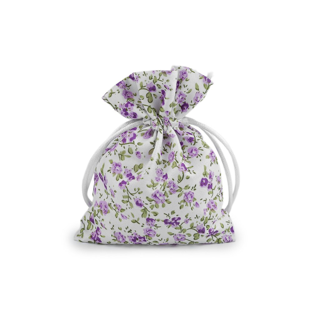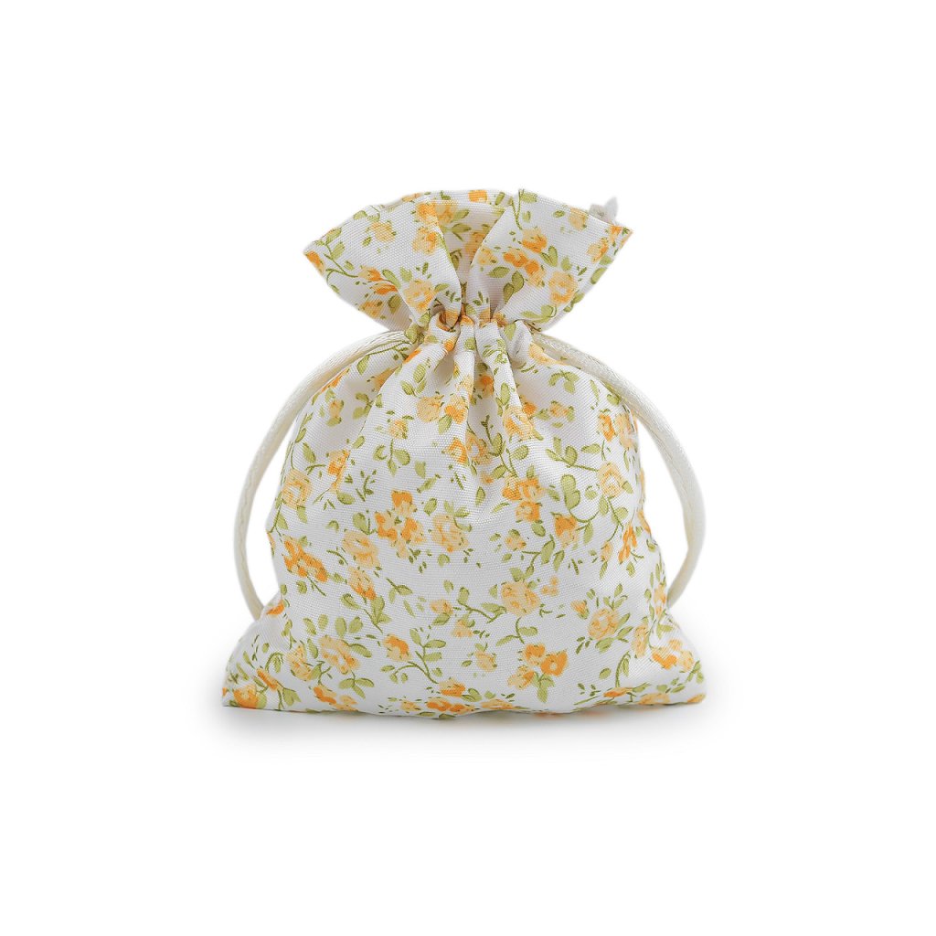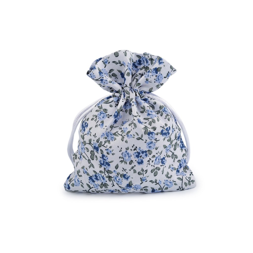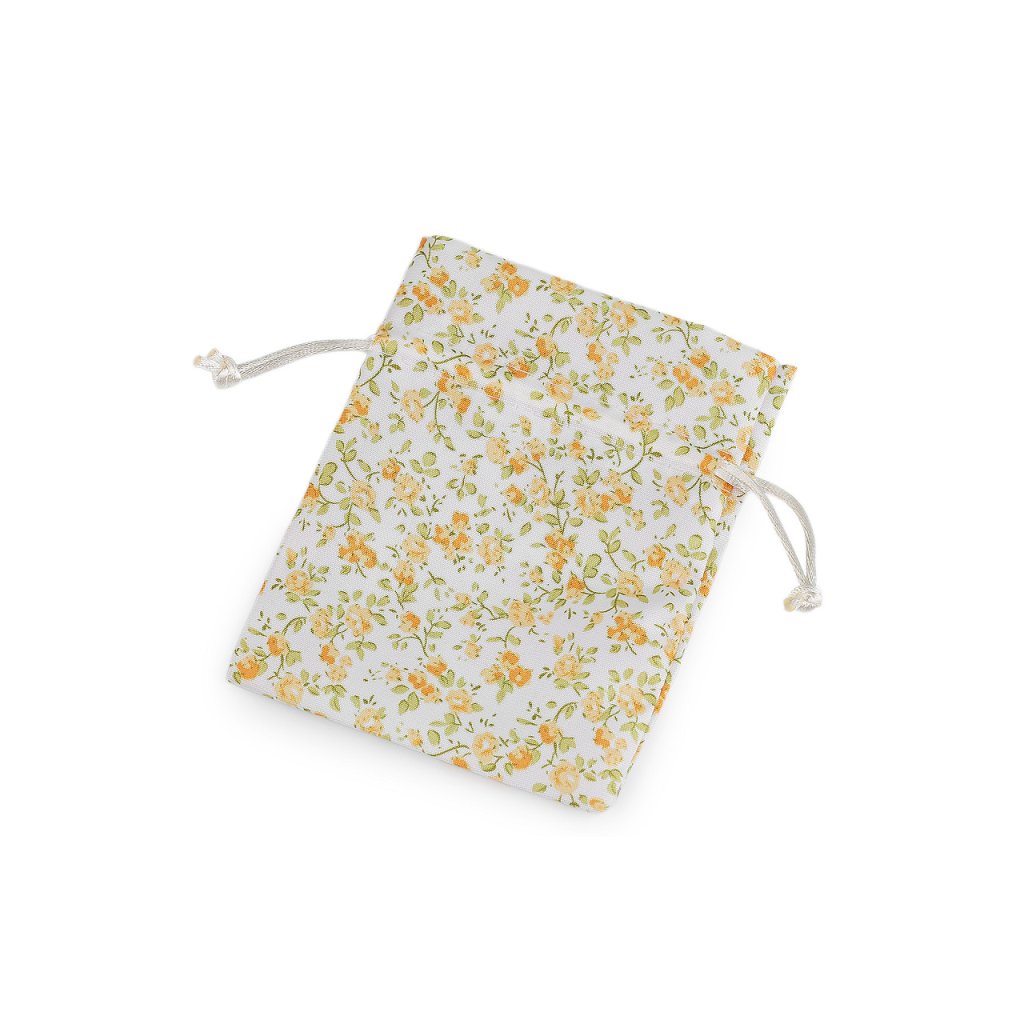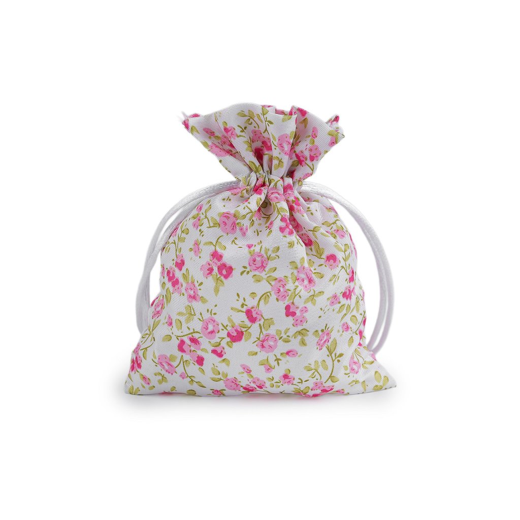 Textilní dárkový pytlík s drobnými květy působí romantickým dojmem. Snadno se uzavírá pomocí dvou stahovacích saténových šňůrek.