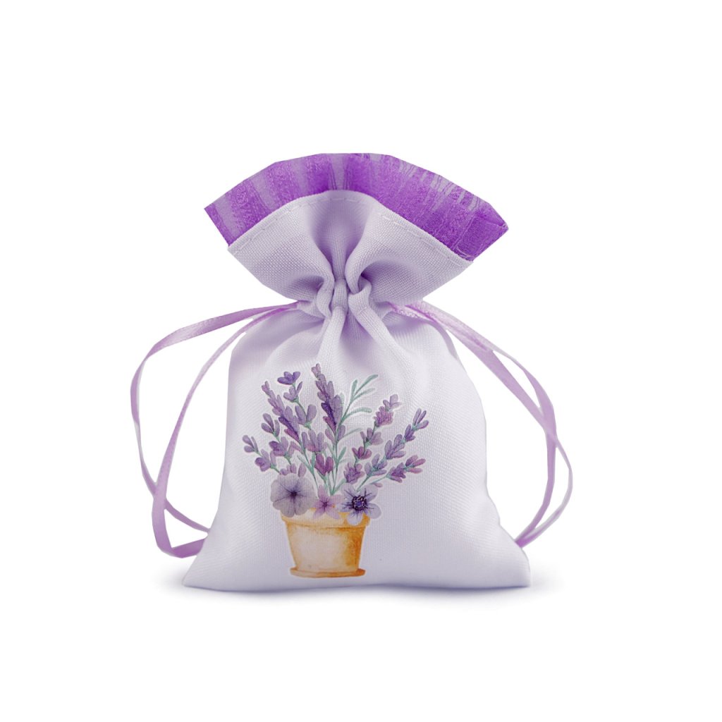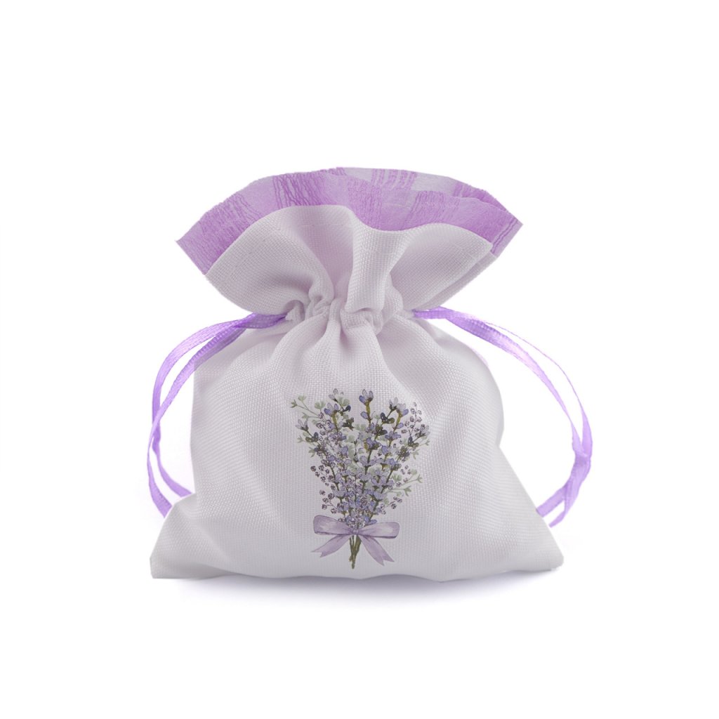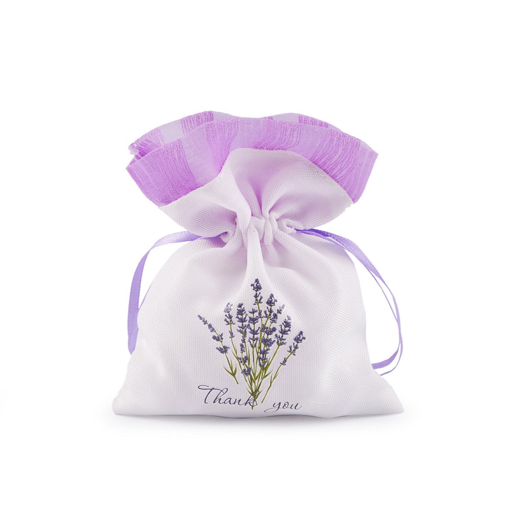 Plátěný dárkový pytlík je ozdobený potiskem květů levandule. Nahoře je olemovaný organzou. Snadno se uzavírá pomocí dvou stahovacích saténových šňůrek.