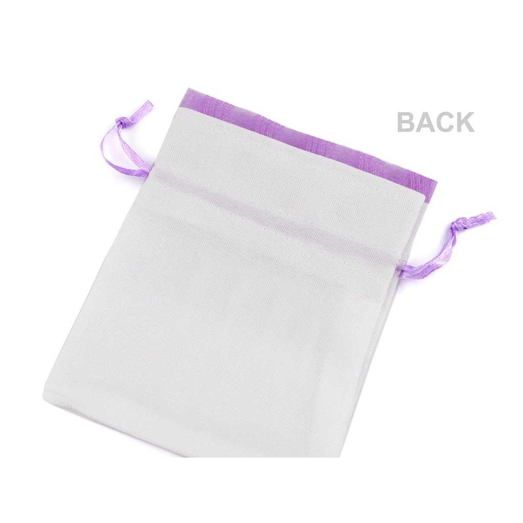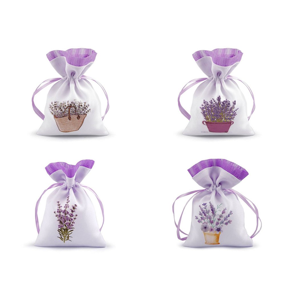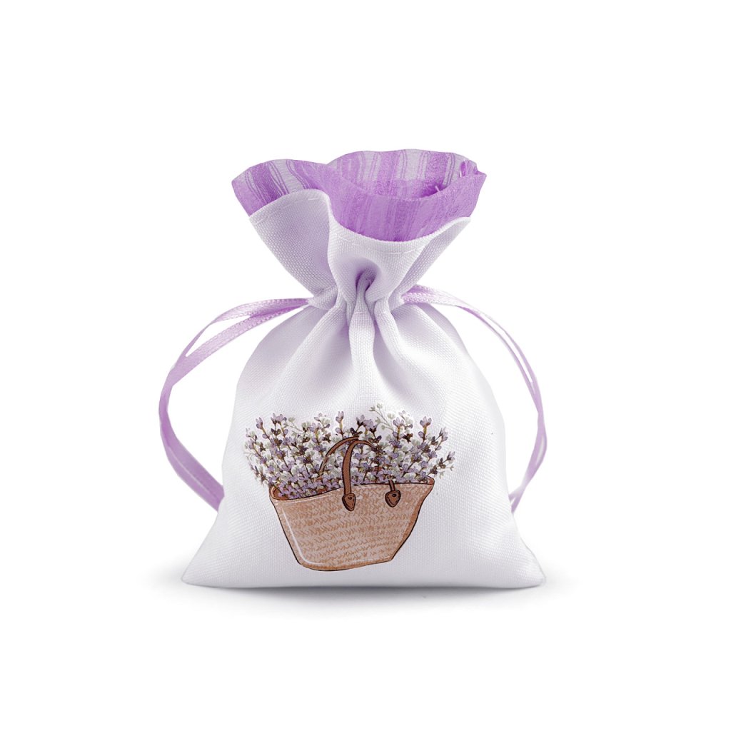 Plátěný dárkový pytlík je ozdobený potiskem květů levandule. Nahoře je olemovaný organzou. Snadno se uzavírá pomocí dvou stahovacích saténových šňůrek.