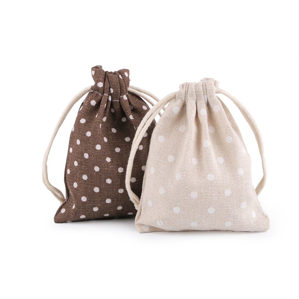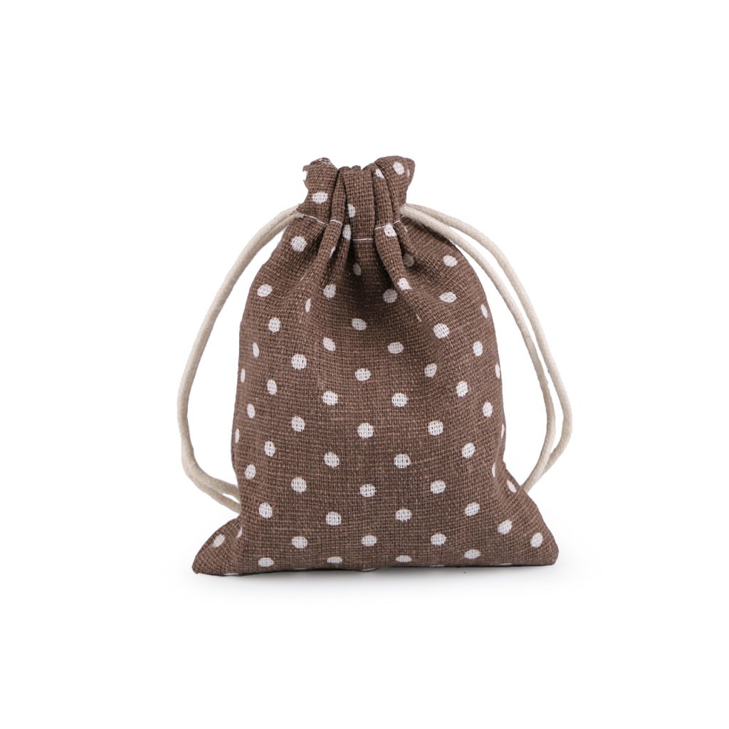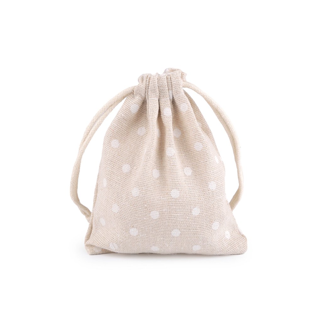 Pytlík je vyrobený z kvalitního a pevného materiálu. Snadno se uzavírá pomocí dvou bavlněných stahovacích šňůrek. Má veselý puntíkovaný design.