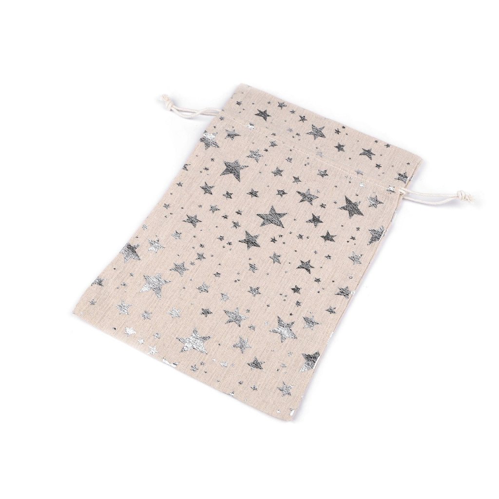 Dárkový pytlík s metalickým potiskem hvězd poslouží na zabalení malých dárků, ale může být i krásnou dekorací na Vánoce. Len, ze kterého je vyrobený, je kvalitní a pevný. Pytlík snadno uzavřete pomocí dvou bavlněných stahovacích šňůrek.