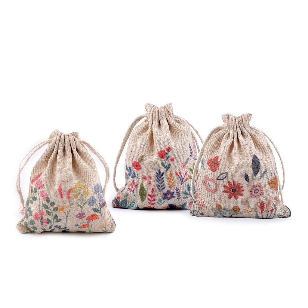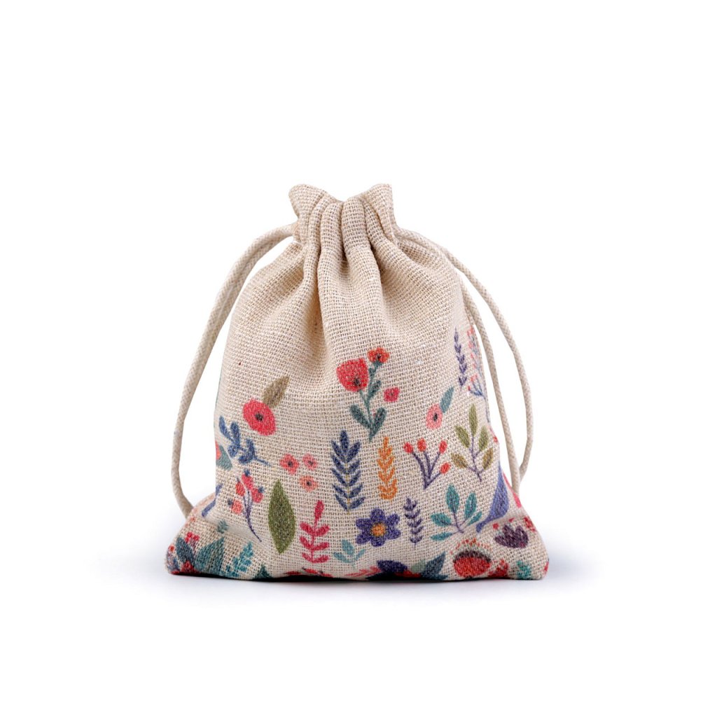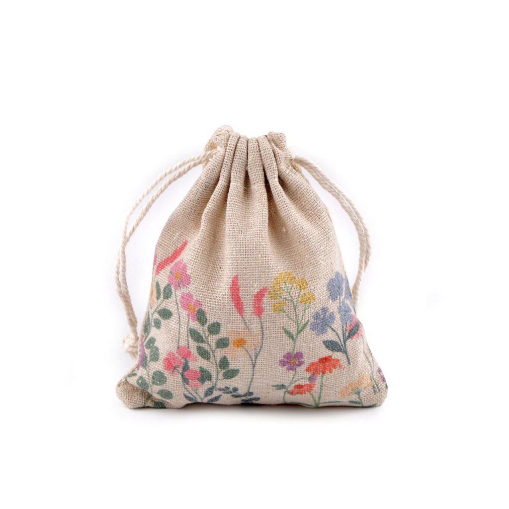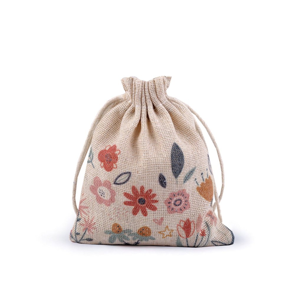 Lněný pytlík zdobí z jedné strany potisk stylizovaných květů. Je kvalitní a pevný, snadno se uzavírá pomocí dvou stahovacích bavlněných šňůrek. Využijete ho celoročně k balení menších dárků, k balení velikonoční výslužky pro koledníky i k jarnímu aranžování.