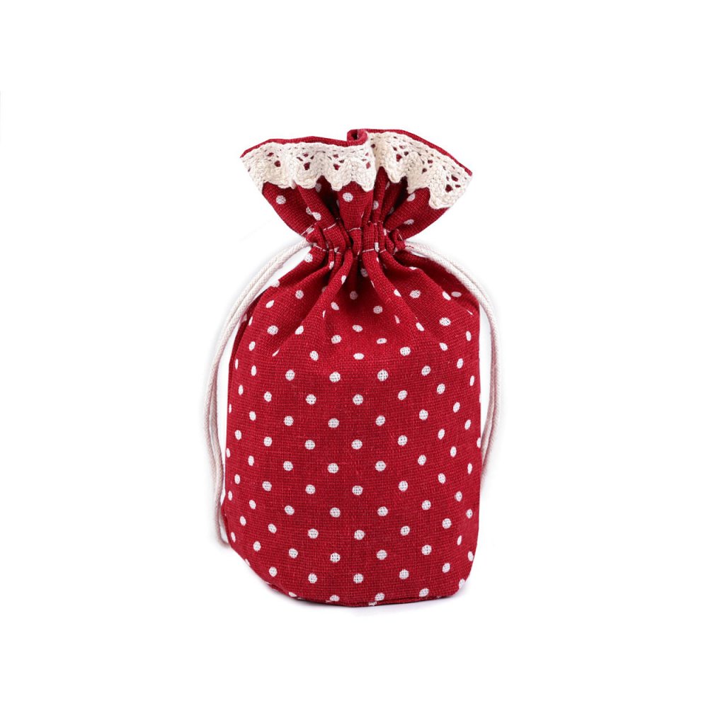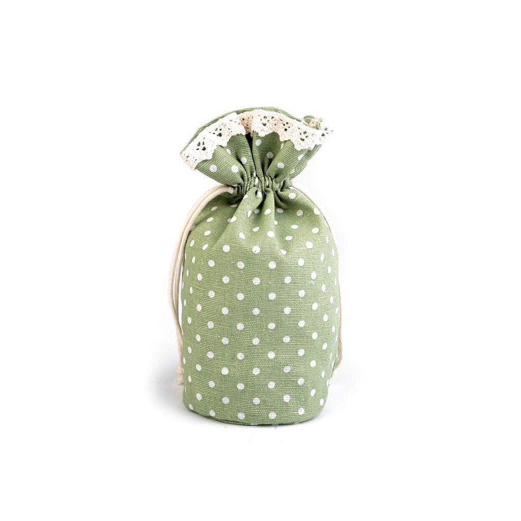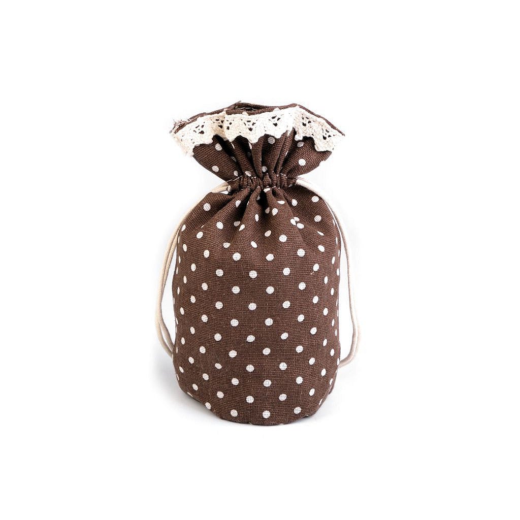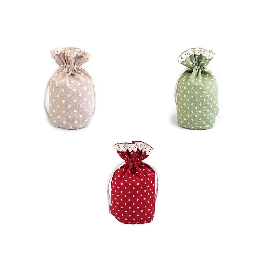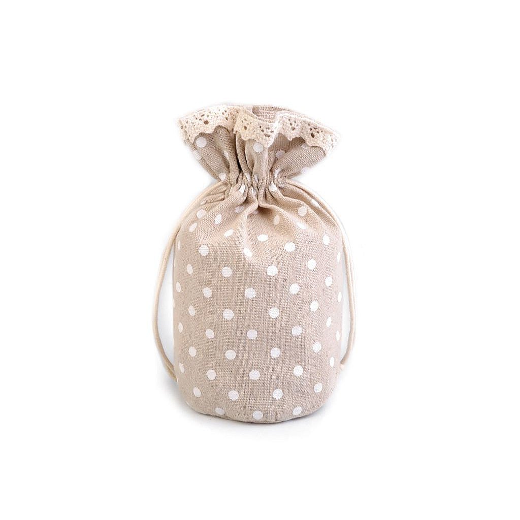 Lněný pytlík s puntíky vzhledově připomíná měšec, dno pytlíku je rozšířené. Uzavřete ho pomocí bavlněných stahovacích šňůrek. Pytlík využijete k zabalení menších dárků či k uložení vonných květů.