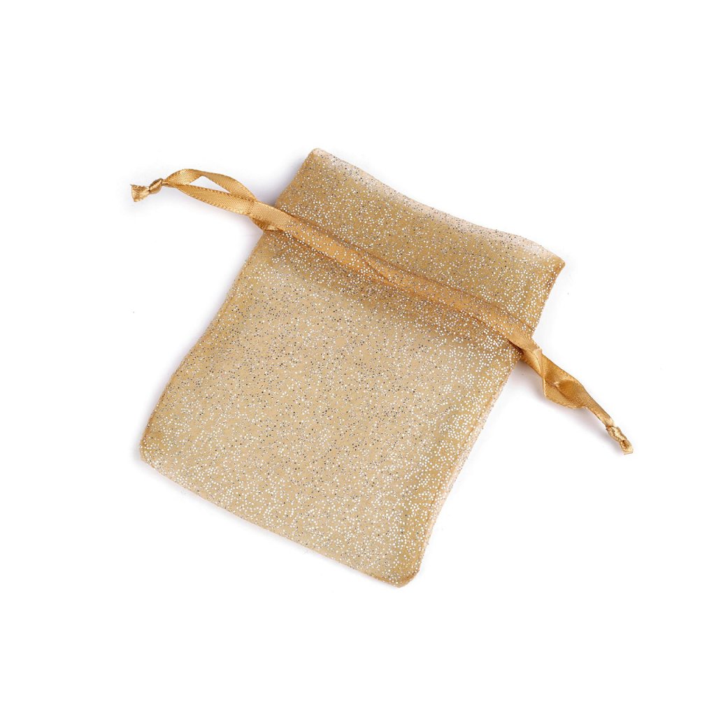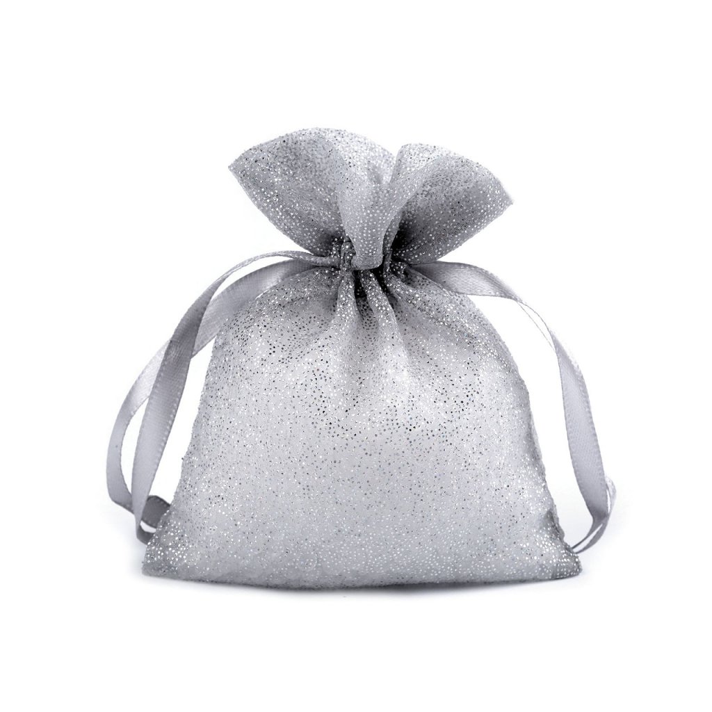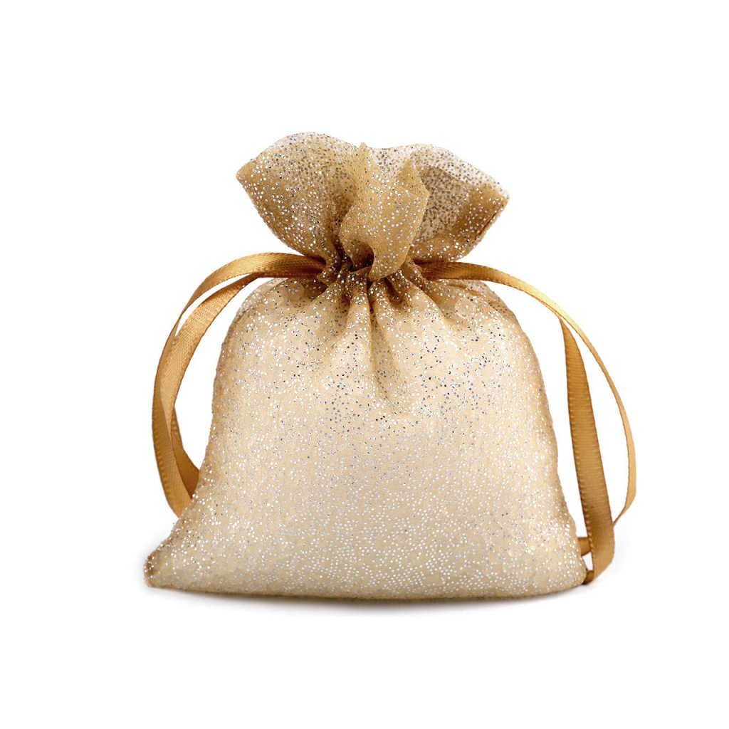 Dárkový organzový pytlíček je celý posetý glitry, díky kterým se poutavě třpytí. Působí luxusním dojmem. Hodí se k zabalení menšího dárku, který povýší na vyšší úroveň. Pytlík se snadno uzavírá pomocí dvou stahovacích saténových šňůrek.