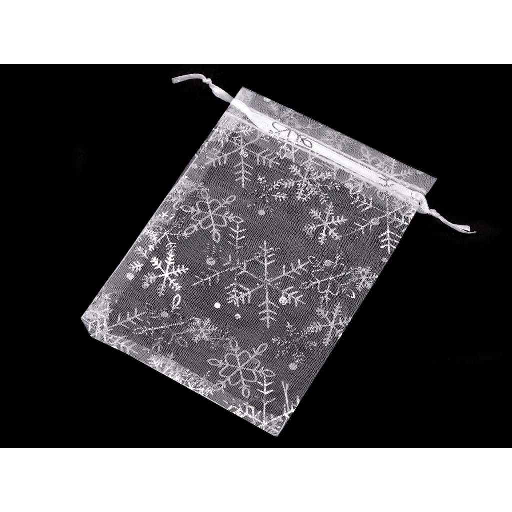 Dárkový pytlíček je vyrobený z průsvitné organzy. Zdobí jej lesklý potisk sněhových vloček. Snadno se uzavírá pomocí dvou stahovacích saténových šňůrek.