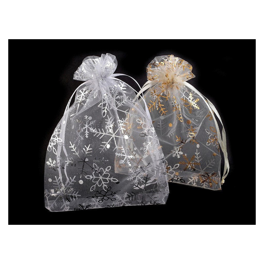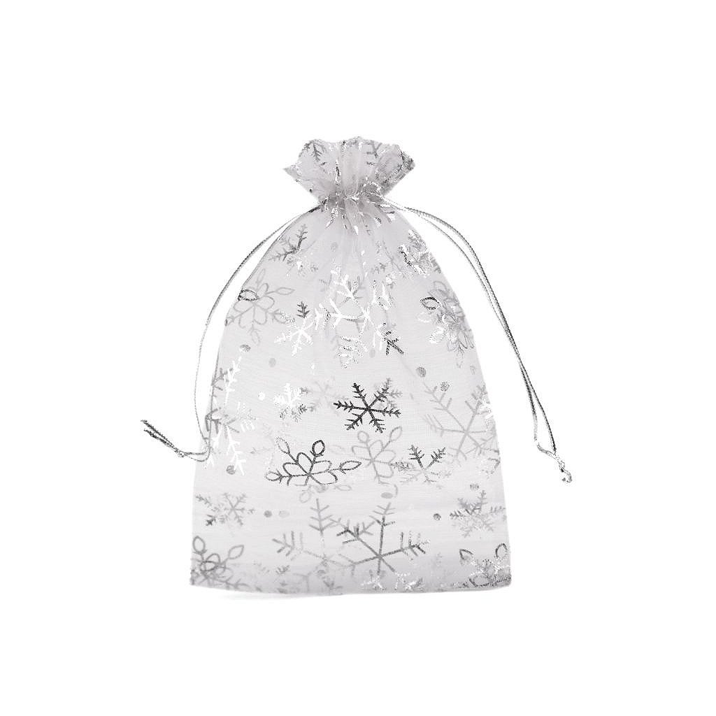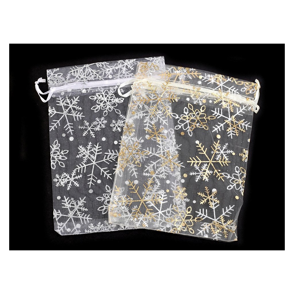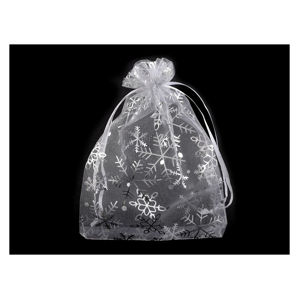 Dárkový pytlíček je vyrobený z organzy a zdobí ho sněhové vločky. Snadno se uzavírá pomocí dvou stahovacích šňůrek.