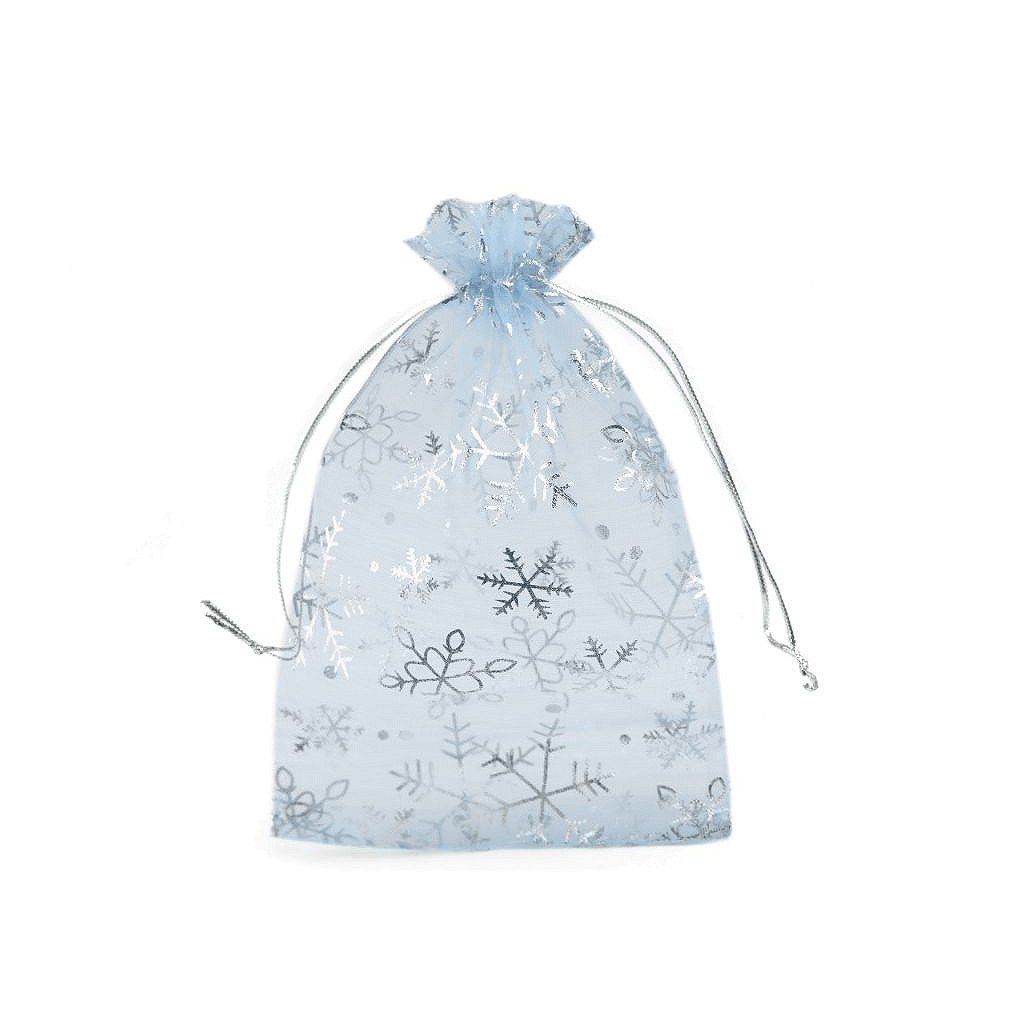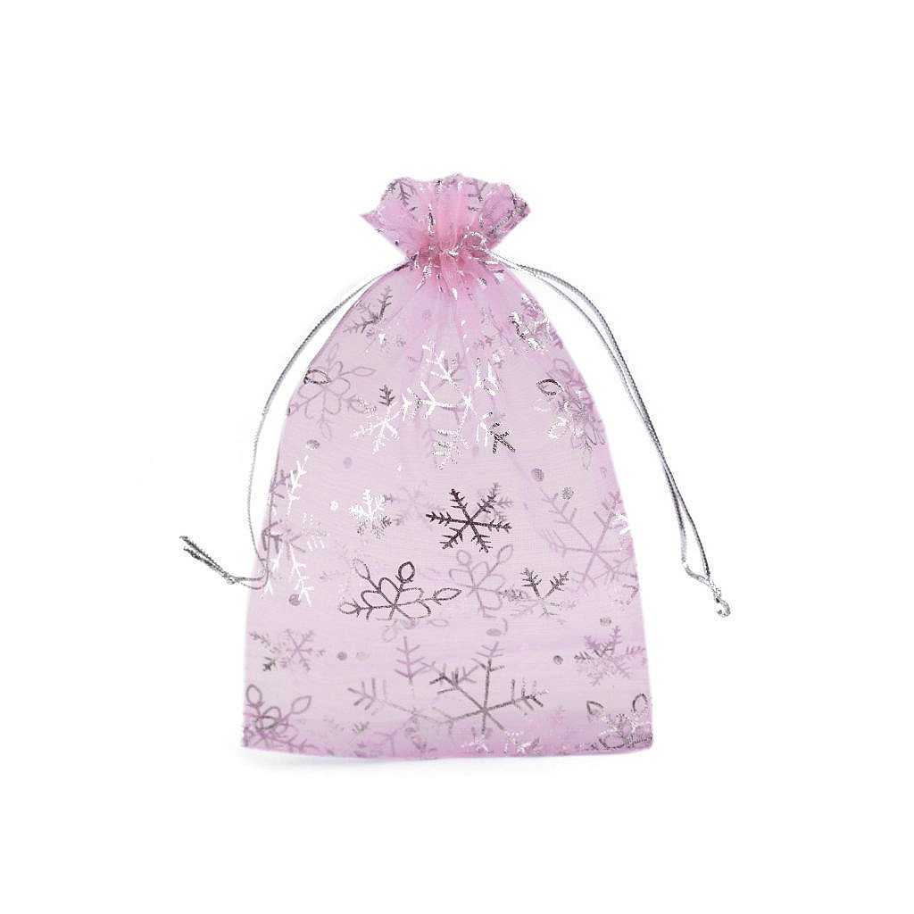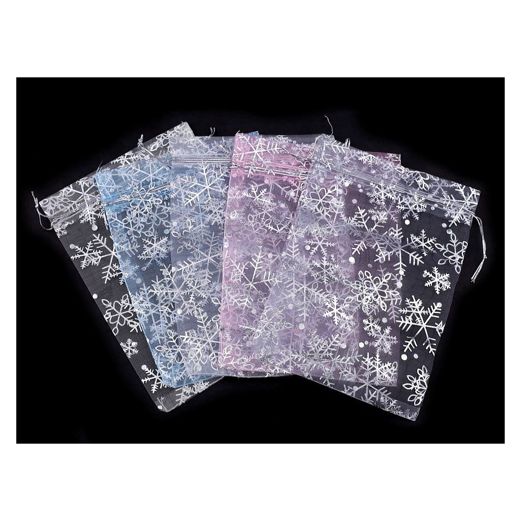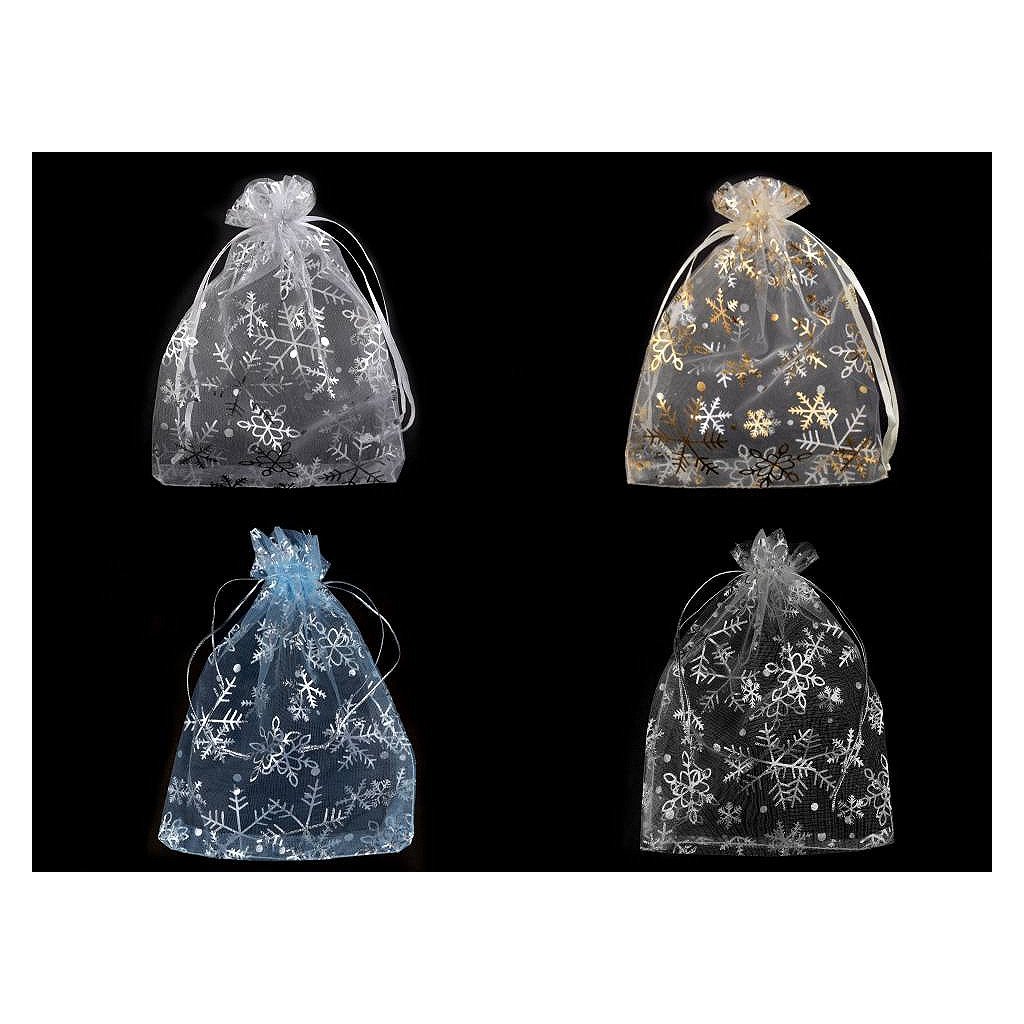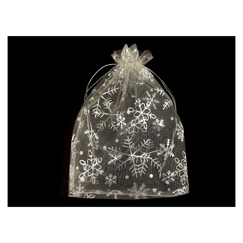 Dárkový pytlíček je vyrobený z organzy a zdobí ho sněhové vločky. Snadno se uzavírá pomocí dvou stahovacích šňůrek.
