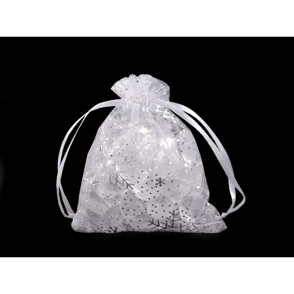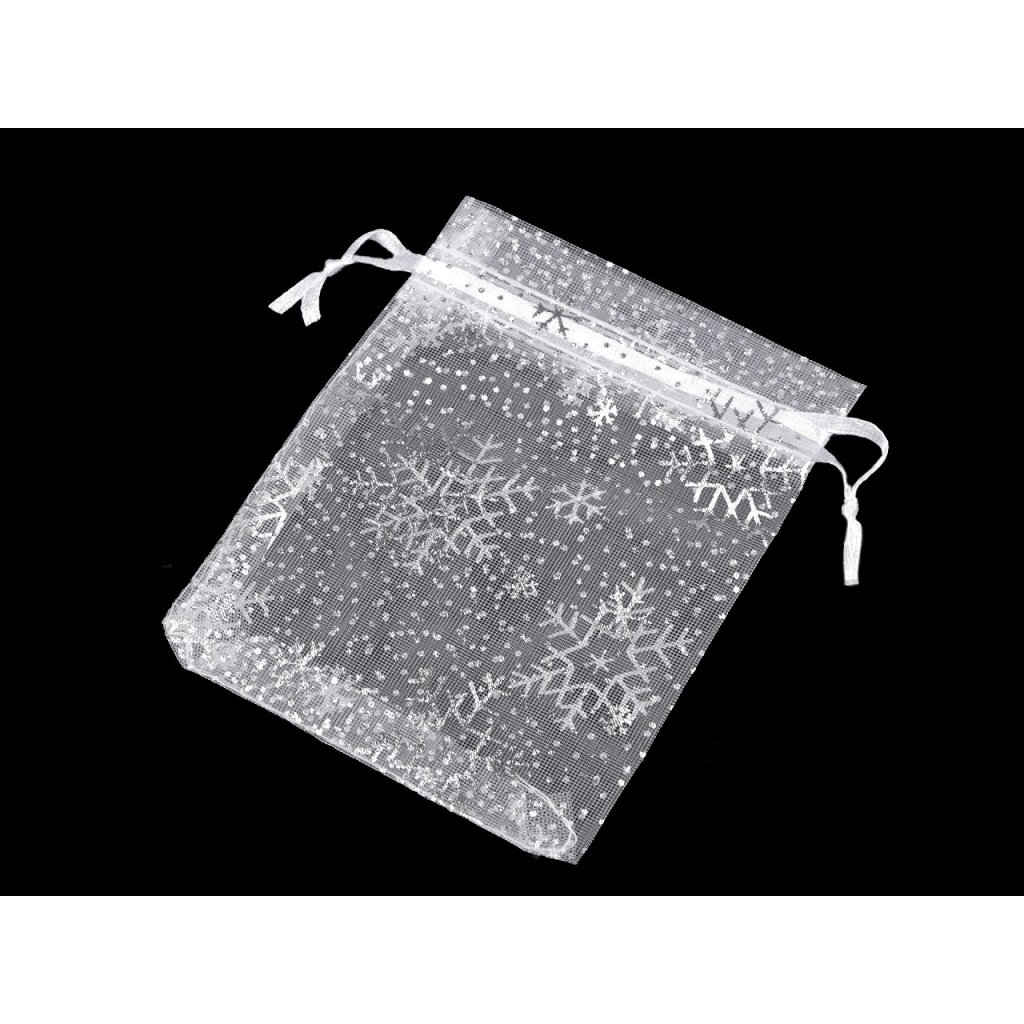 Dárkový pytlík zdobí metalický potisk vloček. Snadno jej uzavřete pomocí dvou stahovacích saténových šňůrek. Pytlík je skvělým pomocníkem při balení drobných dárků.
