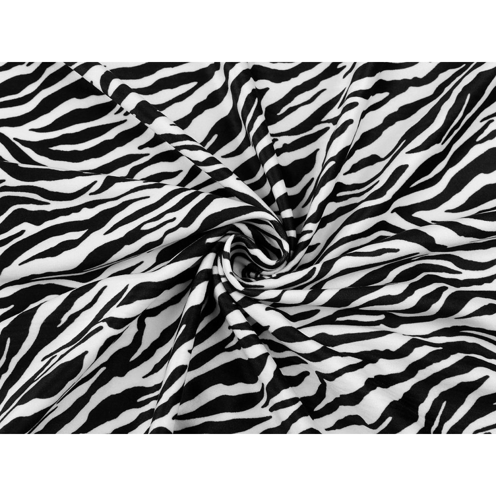 Samet svým designem imituje zebru. Je hladký a příjemný na dotek. Pruží lehce po šíři. Využijete ho na šití šatů, sukní, kardiganů, ale i dekoračních polštářů apod.