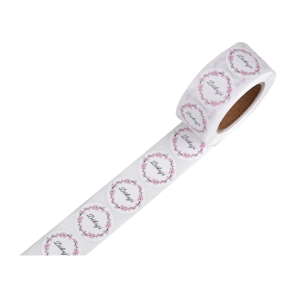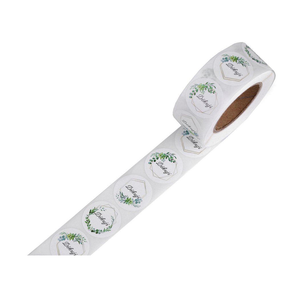 Kulaté papírové samolepky zdobí nápis Děkuji. Využijete je na zdobení přáníček, deníků, dárků, foto rámečků, alb, pozvánek, krabiček apod. Jsou vhodné i na svatební dekorace.
