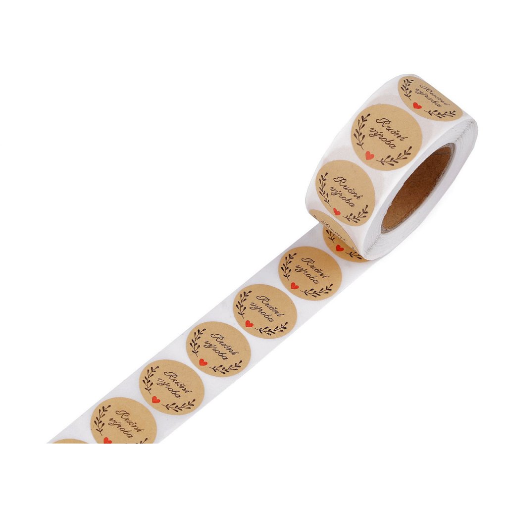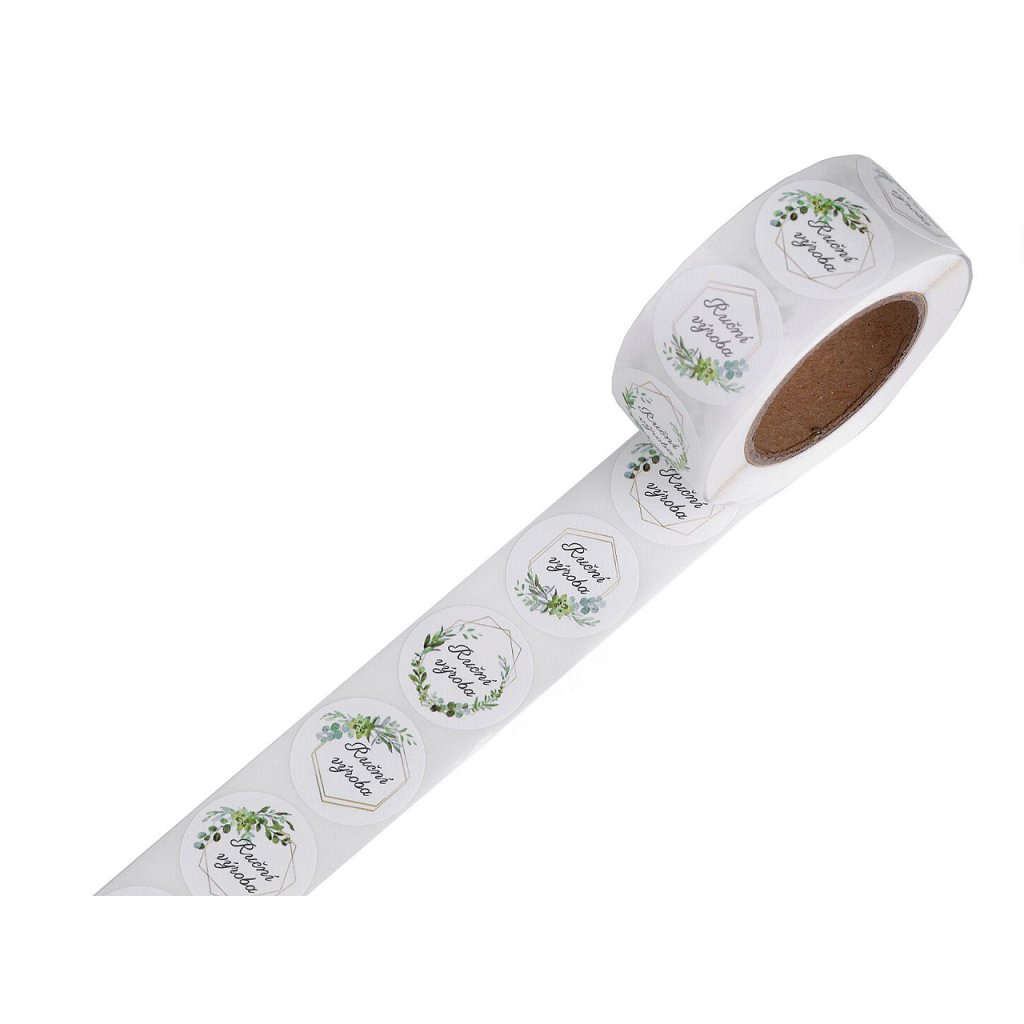 Kulaté papírové samolepky zdobí nápis Ruční výroba. Využijete je na zdobení přáníček, deníků, dárků, foto rámečků, alb, pozvánek, krabiček apod. Jsou vhodné i na svatební dekorace.