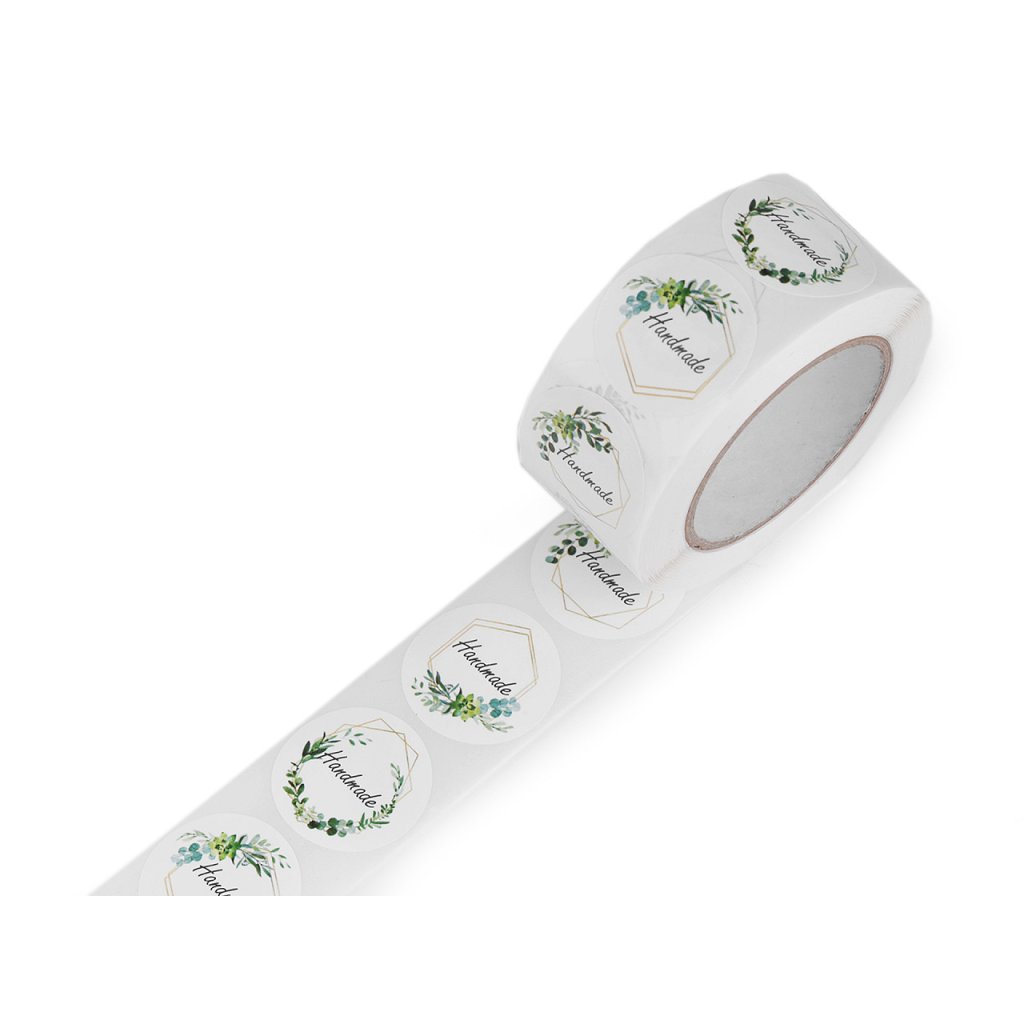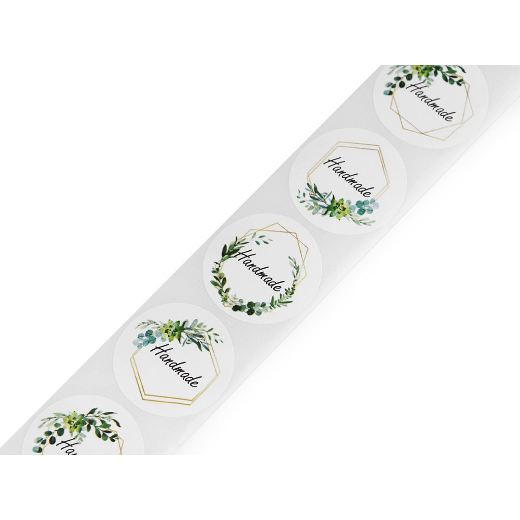 Kulaté samolepky zdobí nápis "Handmade". Využijete je na zdobení dárků, přáníček, deníků, foto rámečků, alb, pozvánek, krabiček apod. Jsou vhodné i na svatební dekorace.