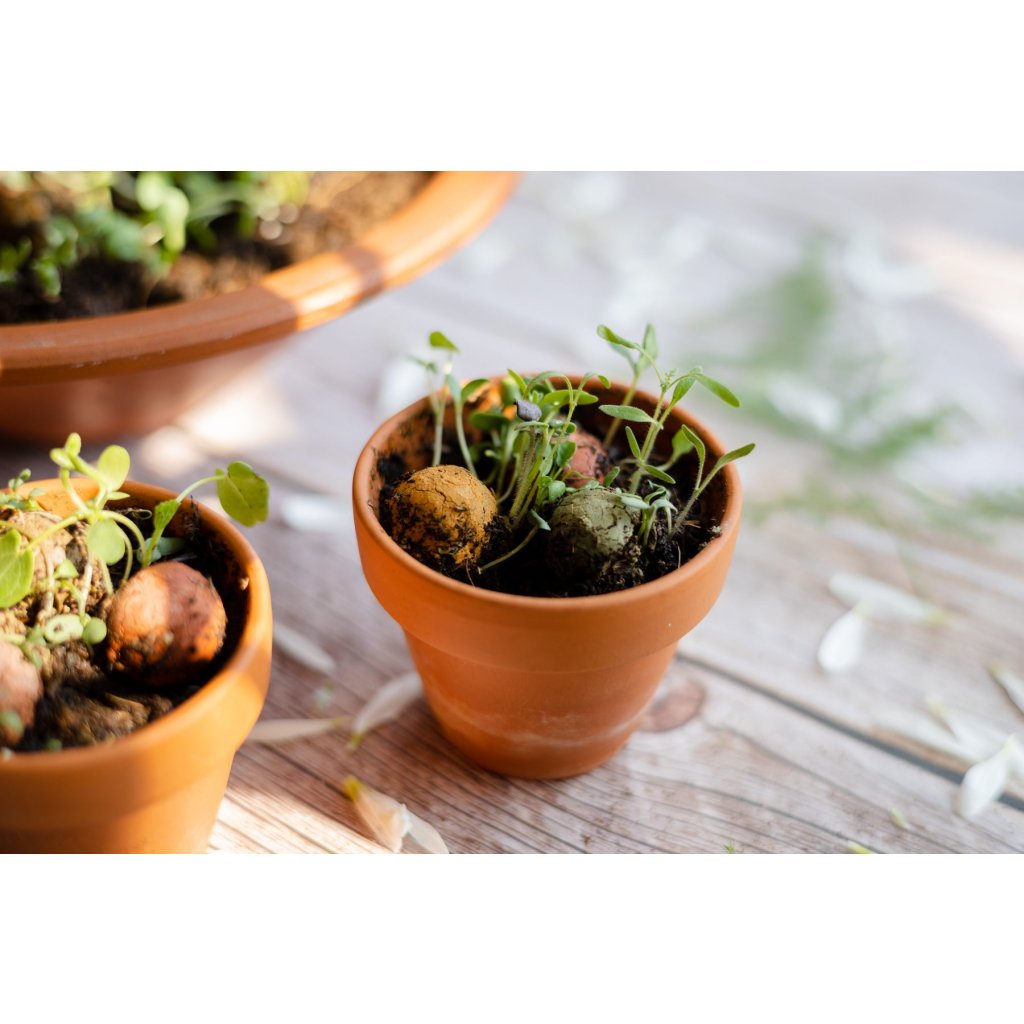 | Složení: | jíl; semínka divokých květin: Agrostemma githago (koukol polní), Trifolium incarnatum (jetel inkarnát), Malva sylvestris (sléz lesní), Papaver rhoeas (vlčí mák), Sanguisorba minor/ Poterium sanguisorba (krvavec menší), Centaurea cyanus (chrpa modrá), Coriandrum sativum (koriandr setý), Trifolium resupinatum (jetel zvrácený), Phacelia tanacetifolia (svazenka vratičolistá), Linum usitatissimum (len setý), Camelina sativa (lnička setá), Trifolium repens (jetel plazivý), Nigella sativa (černucha setá), Melilotus officinalis (komonice lékařská), Chrysanthemum segetum (zlateň osenní), Carum carvi (kmín kořenný), Diplotaxis tenuifolia (křez tenkolistý), Cichorium intybus var. Intybus (čekanka obecná), Chrysanthemum ircutianum/Leucanthemum vulgare (kopretina irkutská/kopretina bílá), Achillea millefolium (řebříček obecný), Trifolium pratense (jetel luční), Chamomilla recutita/Matricaria chamomilla (heřmánek pravý), Plantago lanceolata (jitrocel kopinatý), Brassica juncea (brukev sítinovitá); přírodní barevné pigmenty |