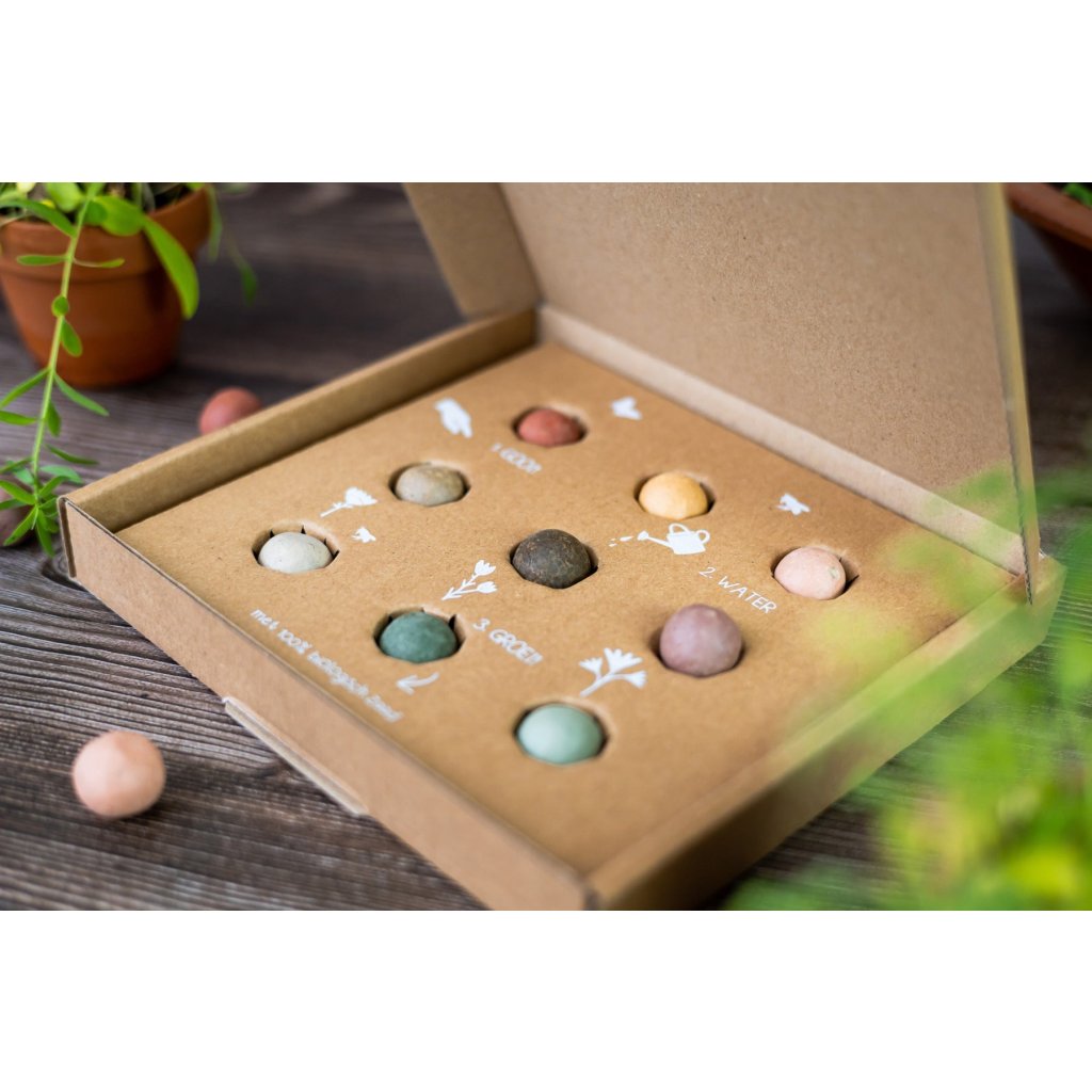 Rádi nadělujete dárky, které mají skutečný smysl? Pak jsou 100% přírodní semínkové bomby trefa do černého, tedy vlastně pestrobarevného. :) Do půvabné dárkové sady určené všem maminkám ukryli v nizozemském Blossombs 9 jílových kuliček se semínky BIO divokého lučního kvítí jako je vlčí mák, kopretina, řebříček, chrpa nebo jetel. Stačí je položit do měkké hlíny a po vykvetení vykouzlí úsměv vám a poskytnou azyl a potravu zvědavým včelím, čmeláčím nebo třeba motýlím sosáčkům.